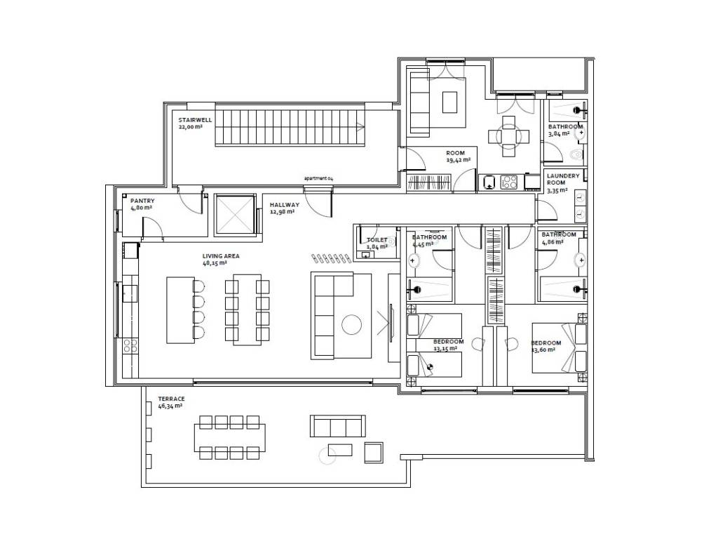 A smaller hallway leads to three bedrooms, each with its own bathroom. There is an additional toilet and laundry room in the apartment. Living rooms, as well as all bedrooms, have access to a covered terrace.