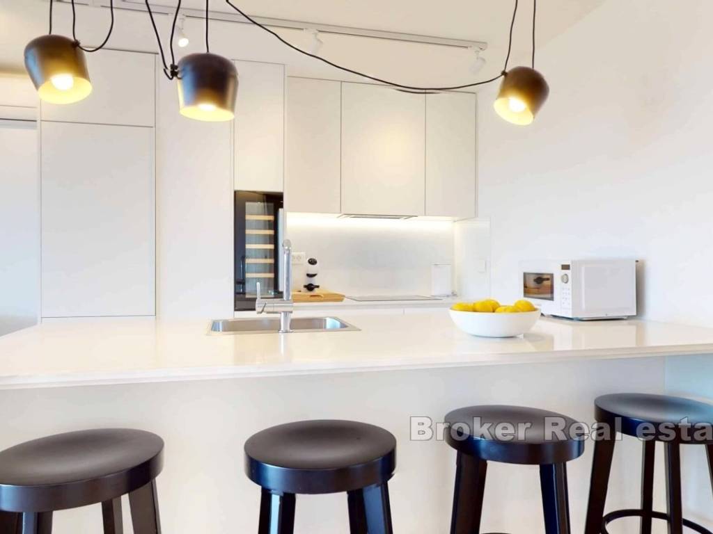 With a total area of 90m, the apartment consists of an entrance hallway, two spacious bedroomsone of which is a master bedroom with an en-suite bathroom and direct access to the terracean additional bathroom with a modern shower and underfloor heating, and an open-plan living and dining area filled with natural light. The fully equipped kitchen, featuring additional workspace, ensures maximum practicality.