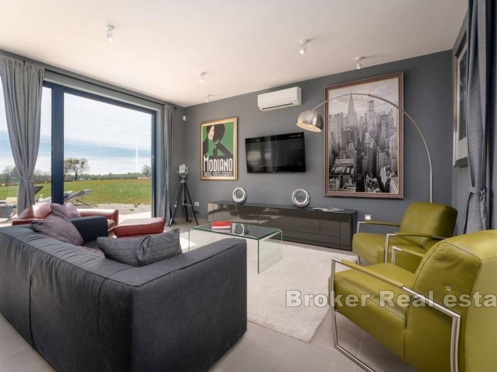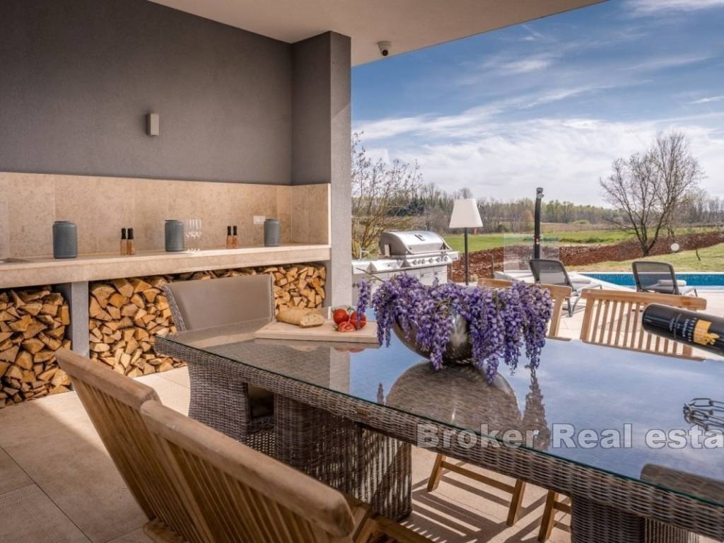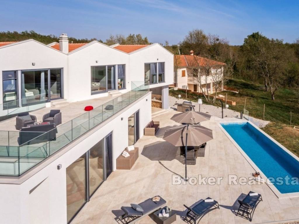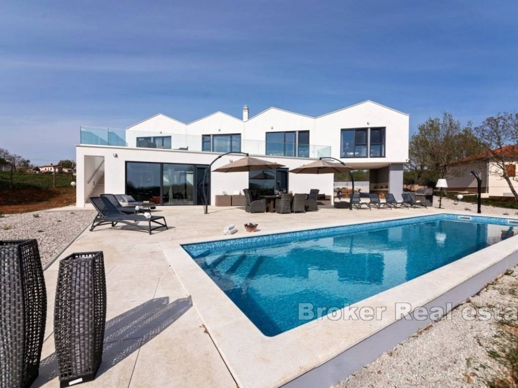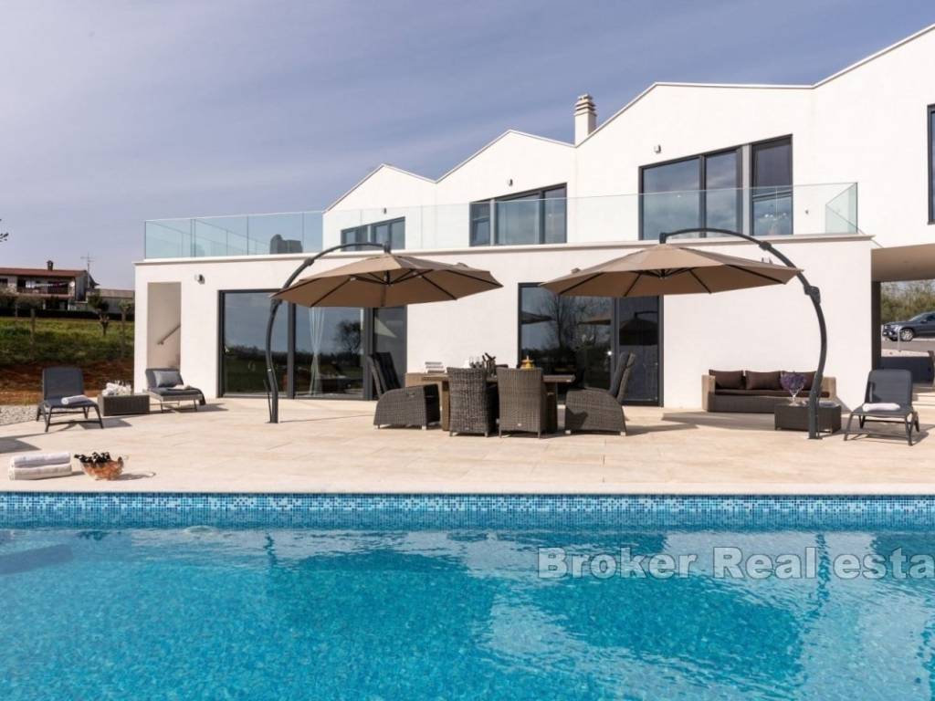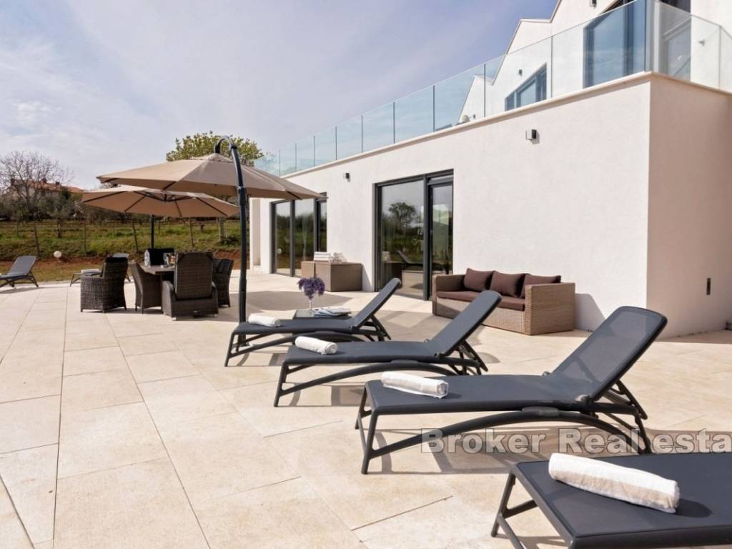 A modern furnished and equipped villa is for sale in an extremely quiet location, not far from Poreč. On a spacious plot of 6271 m2, there is a two-story villa with a living area of 454 m2.