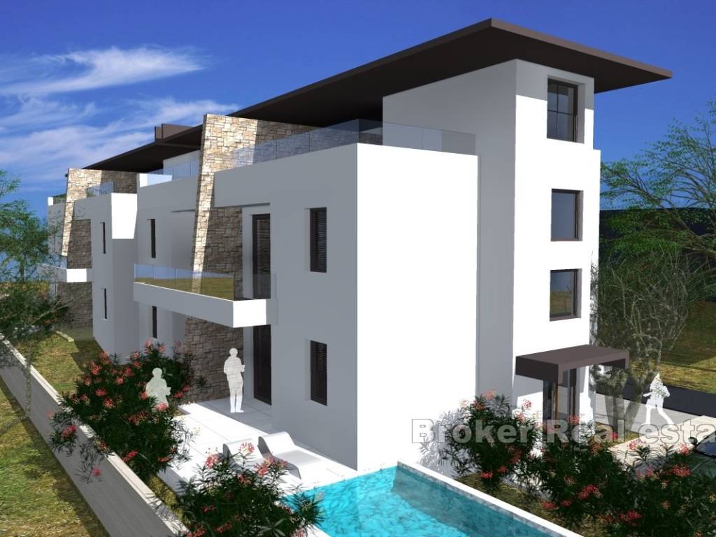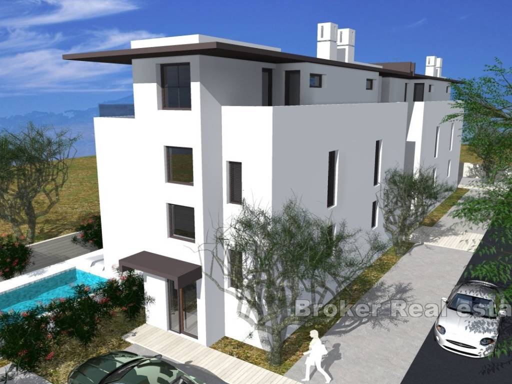 The unit extends over two floors and a roof terrace with a view of the sea. On the ground floor of the house there are three bedrooms and a bathroom with access to the terrace and garden. An internal staircase leads to the upper floor of the house, which consists of a kitchen, dining room, living room and toilet. A private staircase leads to the roof terrace where there is a toilet and the necessary installations for installing a summer kitchen and jacuzzi. On the south side of the roof terrace there is also a sun deck with an excellent view of the sea.