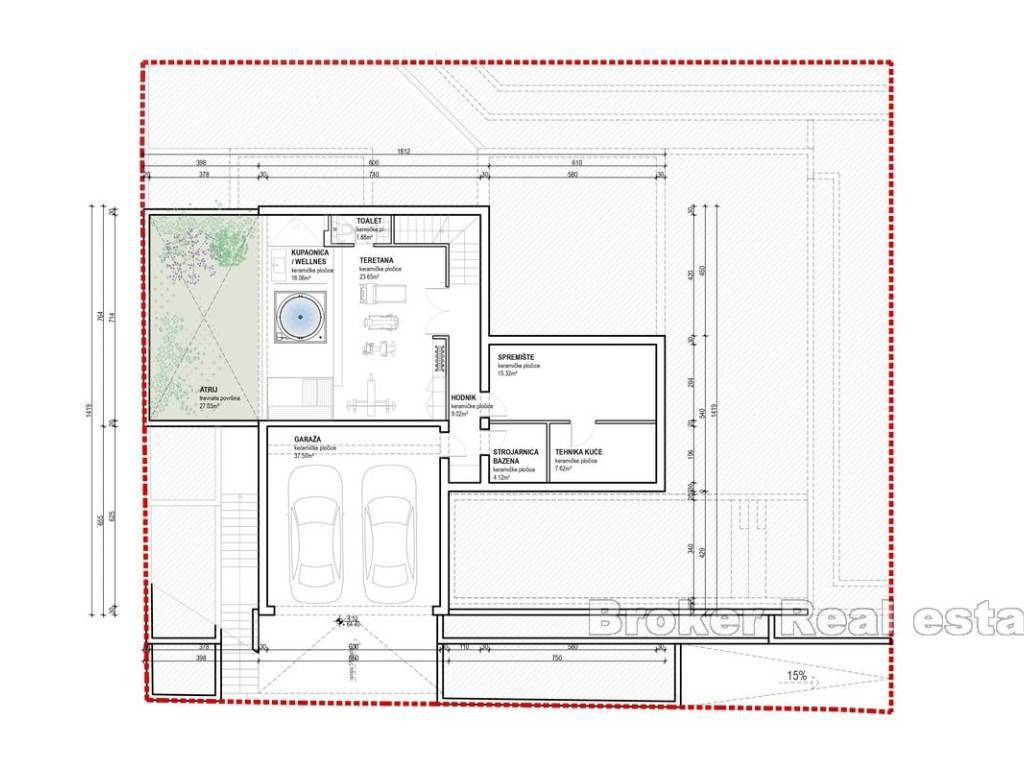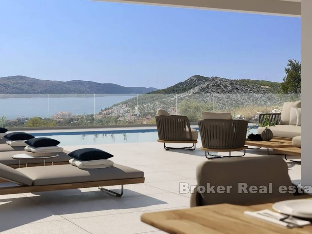 A modern villa with sea view, located in a picturesque and peaceful village not far from Trogir. The villa has a living area of 445 m spread over three floors, and is set on a plot of approximately 580 m. The basement of the villa contains a garage, storage room, engine room, gym, wellness area with bathroom and additional toilet, and an atrium that allows natural light and ventilation.