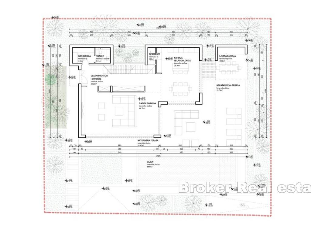 The ground floor includes a spacious living room, kitchen and dining room, storage room, dressing room and toilet. The living room opens onto two terraces a covered terrace of 48 m and an uncovered terrace of 28 m perfect for enjoying the sea view and sunset. A summer kitchen and swimming pool further complement the outdoor space, providing ideal conditions for relaxation or socializing.