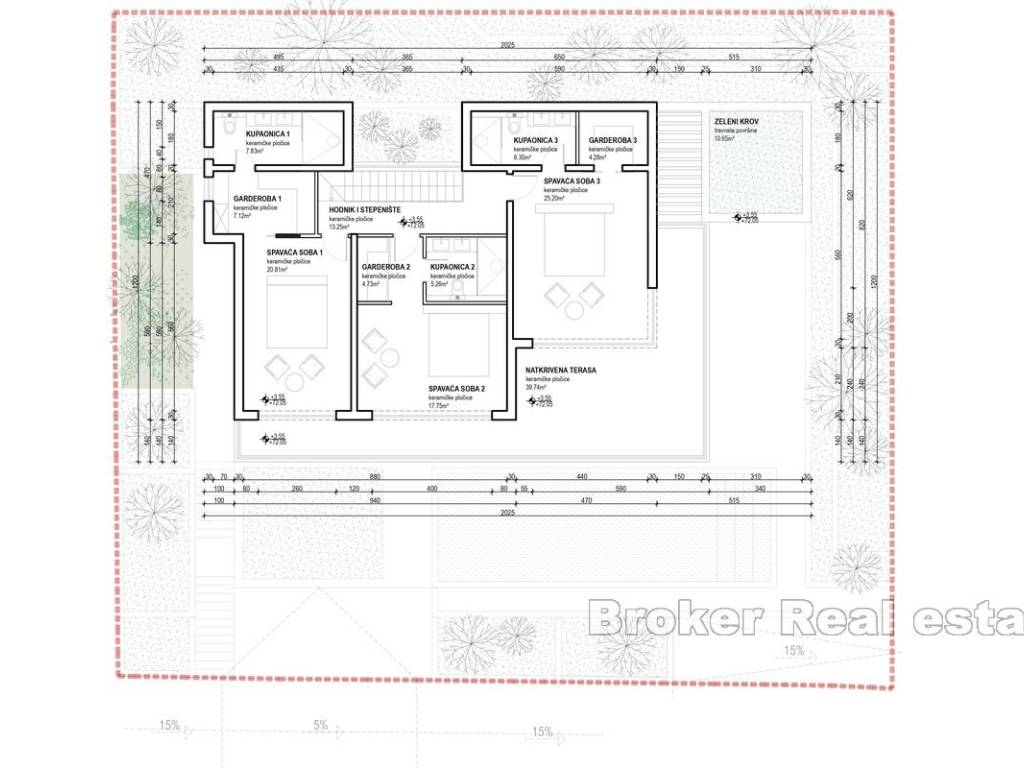 The first floor consists of three bedrooms, each with its own dressing room and bathroom, ensuring maximum privacy and comfort. The green roof and covered terrace on this floor further emphasize the contemporary design and ecological orientation of the villa.
