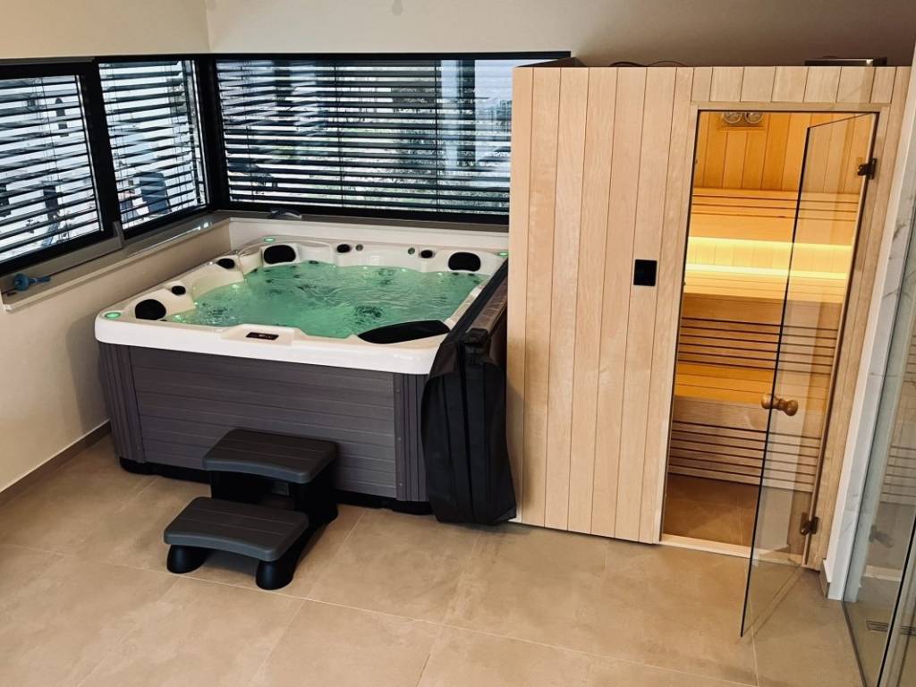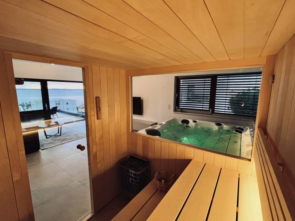 Second floor of a wellness area with a sauna and a jacuzzi with a view of the sea. The wellness area leads to a large terrace with an open view of the sea.