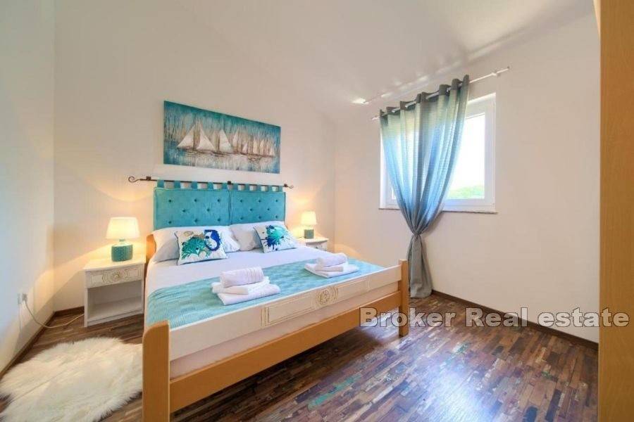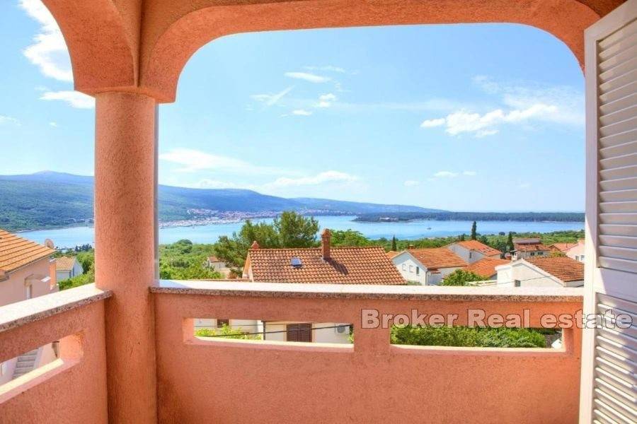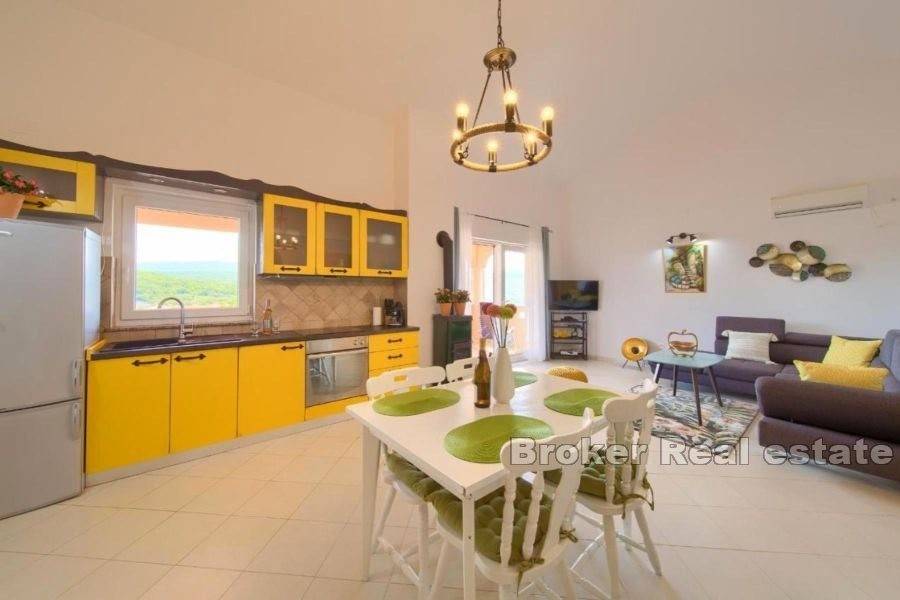 A beautiful apartment for sale located in a quiet location near the town of Krk. The apartment is located on the second floor of a smaller residential building and has a total living area of 73 m2. It consists of an entrance hall, two bedrooms, a bathroom, a kitchen with a dining room and a living room with access to a covered balcony with a stunning view of the surrounding beauty. The apartment is of high quality construction and equipment, and is sold fully furnished, air-conditioned with PVC joinery. It also has one covered parking space in the common yard. Thanks to its location near the sea and all the necessary facilities, it is a real estate ideal for year-round living with the potential to be used for tourist purposes as well.