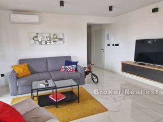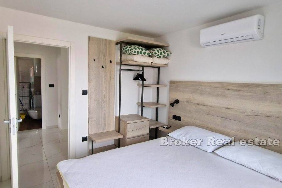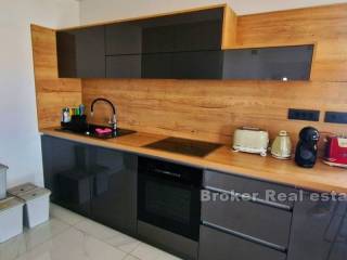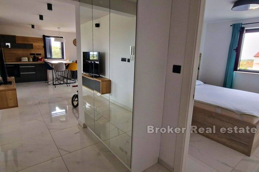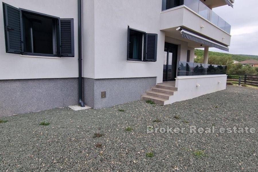 A beautiful modern apartment is for sale on the island of Krk, in the town Punat. The apartment is located on the ground floor of a house with only three residential units. The total living area of 77.57 m2 consists of an entrance hall, two bedrooms, a bathroom, a toilet, and a comfortable living room with a kitchen and dining room. Large sliding walls lead you directly to a covered terrace and a spacious landscaped garden of 222.24 m2 with a soothing view of the sea. The apartment is fully furnished and equipped with quality furniture and electrical appliances and is being sold as such. It has two parking spaces in the common yard of the house as well as a storage room. It is only a 15-minute walk from beautiful beaches.