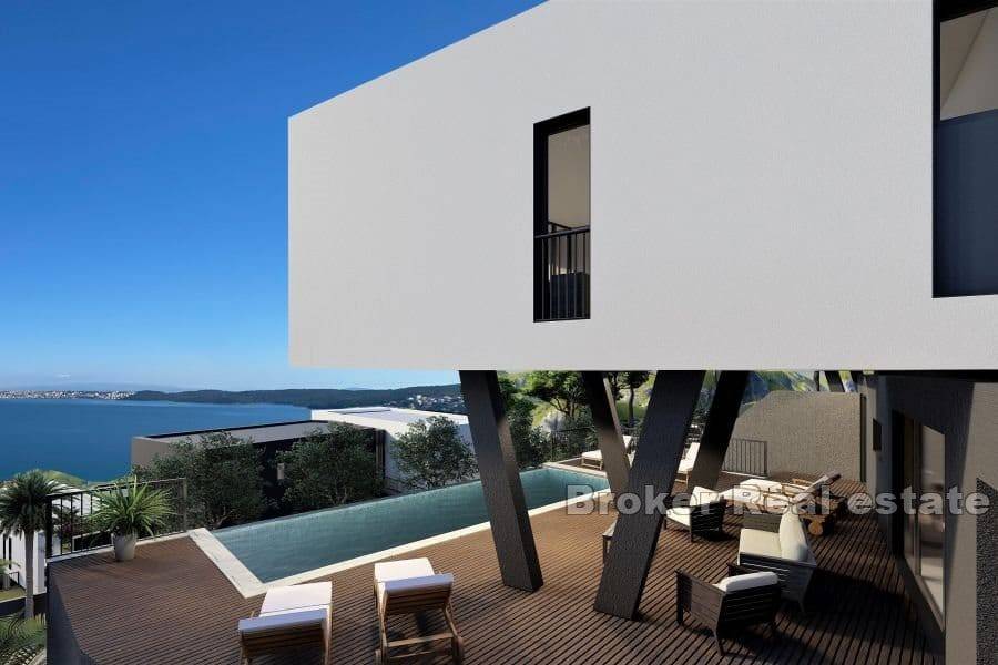 For sale is a semi-detached villa under construction in Trogir, only 350 m from the sea. It has a southwest orientation and an open view of the sea and the island of Čiovo. It will be surrounded by similar newly built villas and it is designed so that as many rooms as possible are oriented towards the sea. It consists of three floors and has 262 m. It has a total of three bedrooms with private bathrooms, one of which has access to its own loggia with a view of the sea. On the ground floor there is a kitchen with a dining room and a living room with a spacious terrace. On the ground floor there is also an entrance area and a toilet, while in the surroundings there is a terrace, a swimming pool and a sunbathing area. Outdoor covered and uncovered parking spaces are provided in the basement of the building, which is fully air conditioned and equipped with underfloor heating via heat pump. It is sold unfurnished and features high quality finishing equipment. The biggest advantage of the property, apart from its position near the sea, is the proximity of all amenities needed on vacation and the distance of only 8,5 km from the airport.