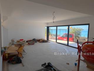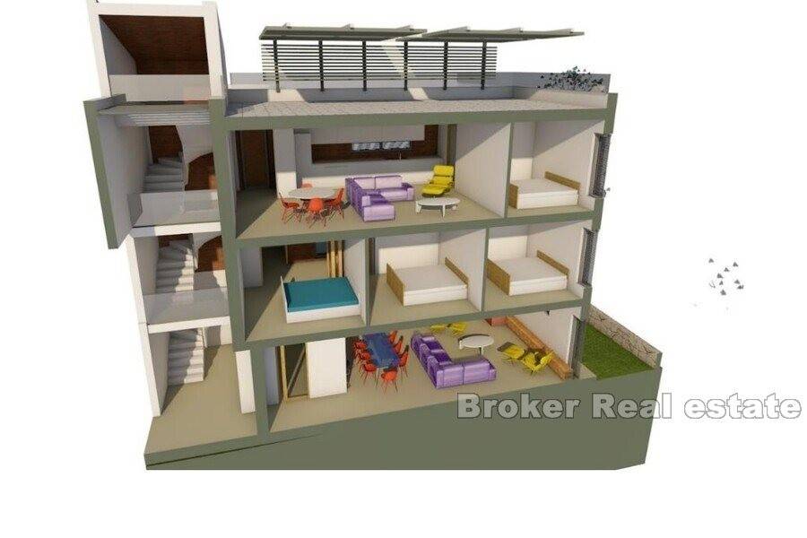 On the ground floor and on the first floor there is a two-story apartment consisting of a living room, kitchen, dining room, terrace, balcony, bathroom, laundry room, an internal staircase leading to the first floor where there are three bedrooms and two bathrooms. All rooms on these lower floors have a view of the sea.