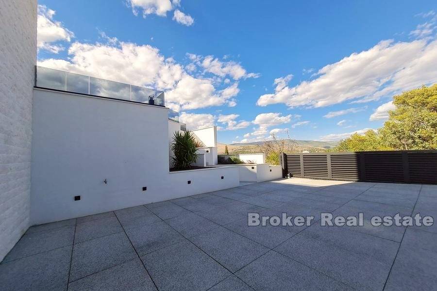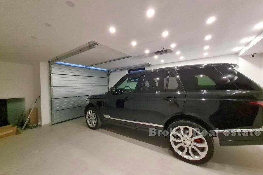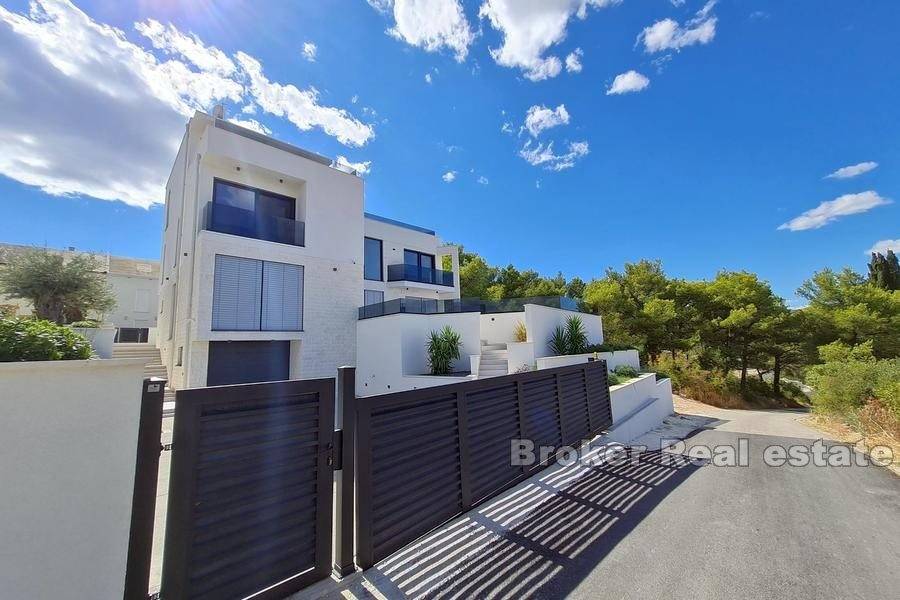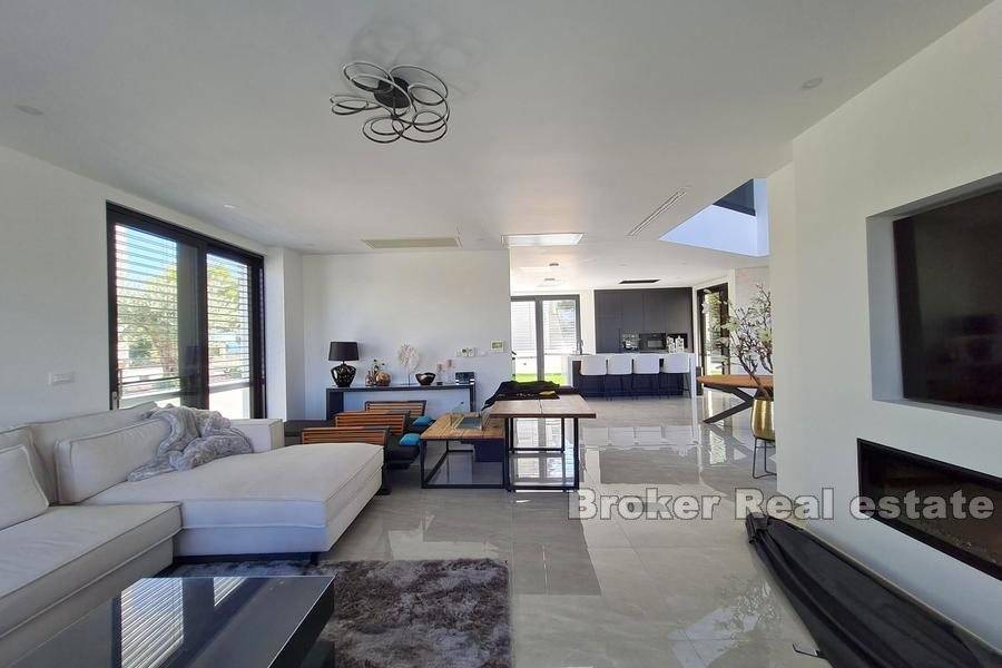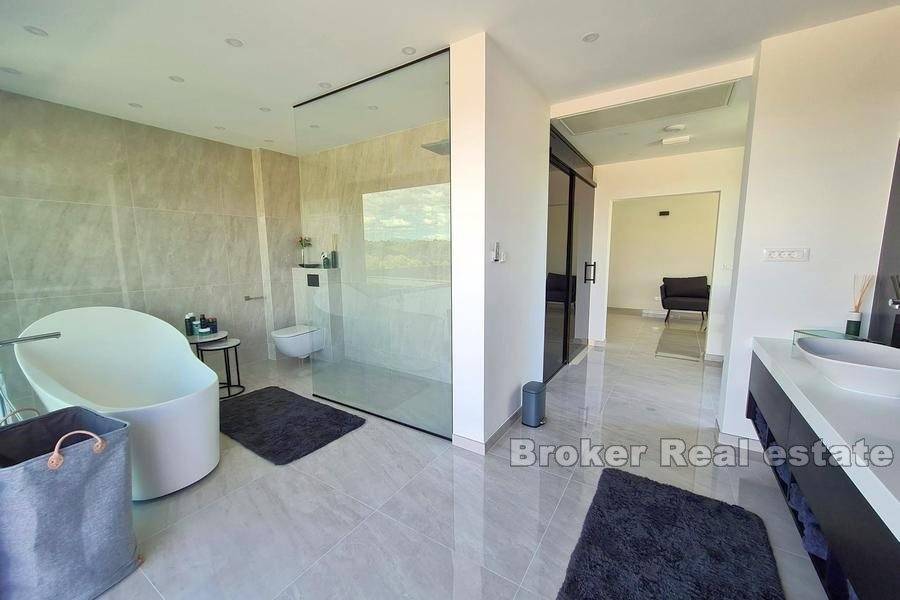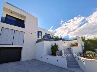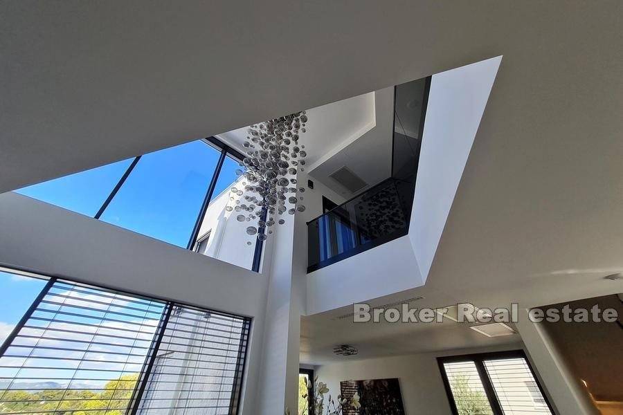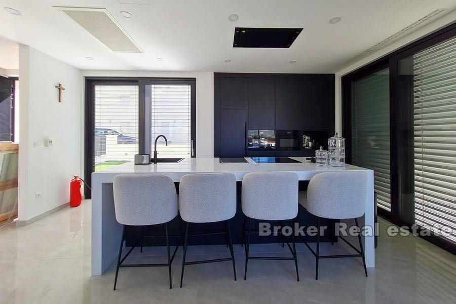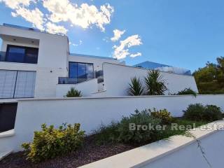 Newly built luxury villa, built and equipped to the highest standards, located in a quiet location in the city of Trogir, on a plot of 591 m2 with landscaped garden with indigenous Mediterranean horticulture and irrigation system, surrounded by greenery and rare, smaller houses. The total area is 370 m2 spread over four floors (basement, ground floor, first floor and second floor).