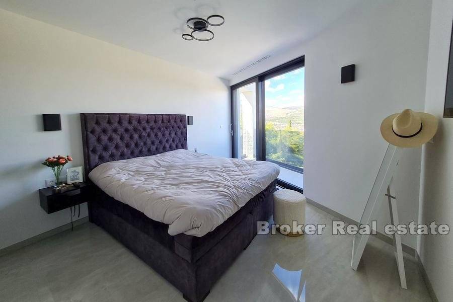 The second floor of the beautiful villa is designed as a unique space with one bedroom and three huge terraces, one of which is covered. It consists of an entrance hall, master bedroom of approx. 30m2 with private bathroom and a covered terrace with open views of the city of Trogir and the sea.