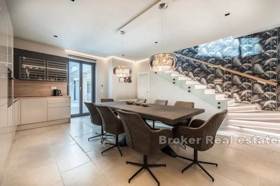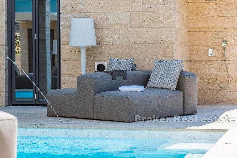 The last floor of these two villas is designed as a place for relaxation and enjoyment, on this floor there are wellness rooms, summer kitchens and a jacuzzi. This floor is also equipped with high-quality lounge furniture and a table for large family gatherings.