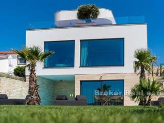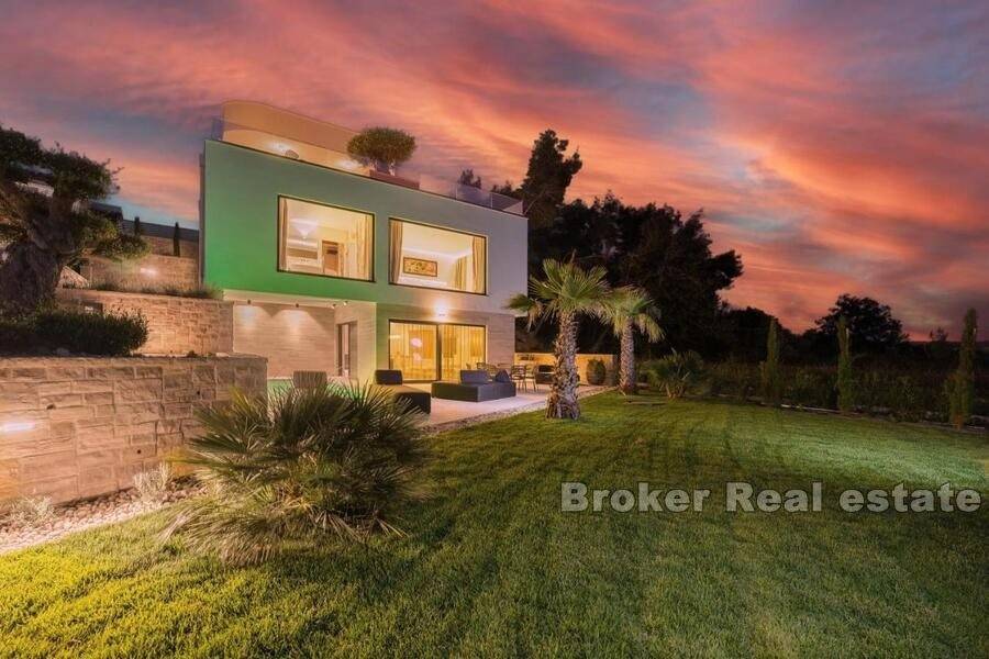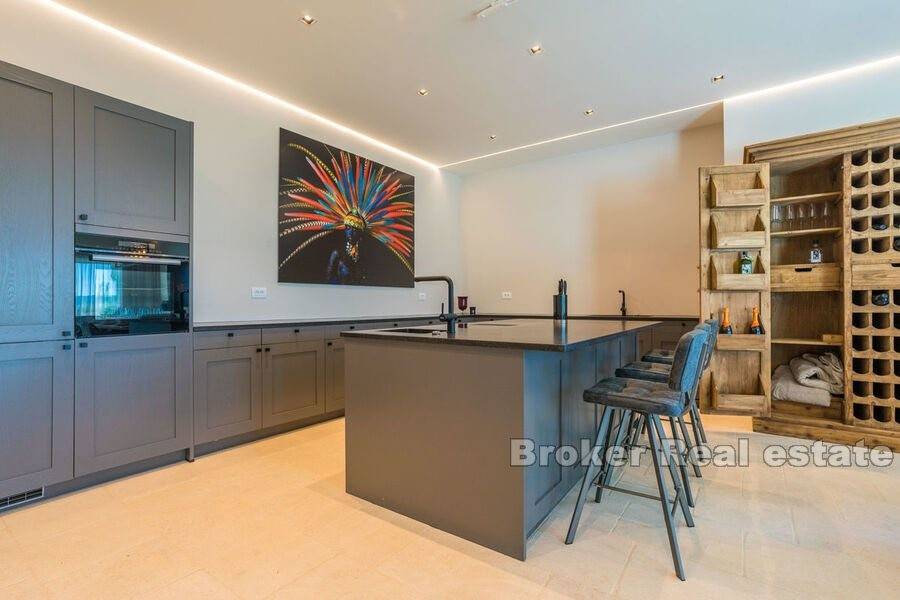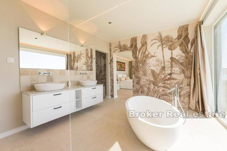 In the construction, high-quality materials were used: aluminum carpentry, floor coverings made of natural French and Portuguese stone, and first-class sanitary ware from Steinberg, Axor and Geberit brands. Thermal insulation on the facade is 10 cm Styrofoam, decorated with Travertino stone, it is fully air-conditioned with underfloor heating in in all rooms.