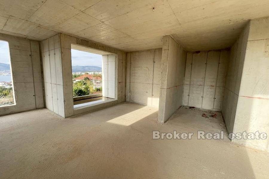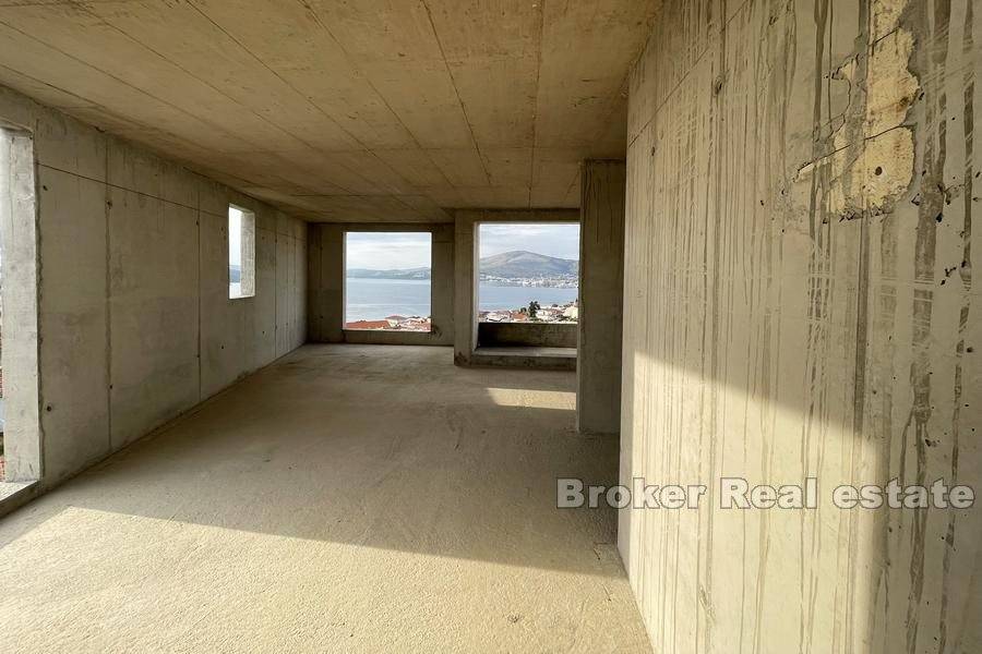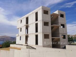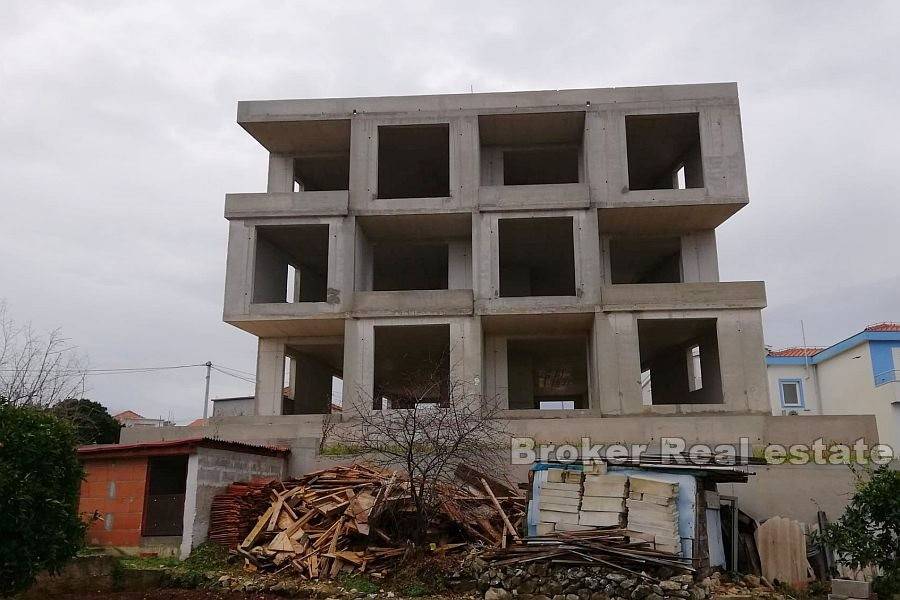 Apartment building with sea view in unfinished edition, for sale. The building is northwest oriented and from each floor, there is a beautiful sea view. The building has three floors on which there are six apartments of approximately 58 m, with the possibility of conversion into three large ones. They are designed as two-bedroom apartments with one bathroom and kitchen and a living room with access to the terrace and sea view. The building has access to the roof and provides two parking spaces for each apartment. There is a possibility of building a swimming pool. Distance from the sea is about 420 m and in the immediate vicinity, there are cafes, restaurants, shops and a kindergarten.