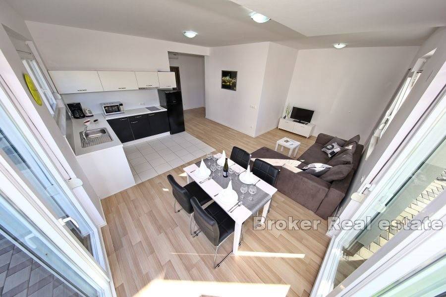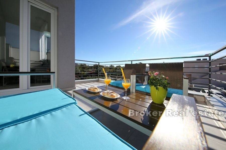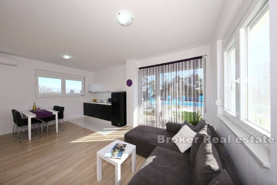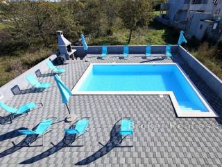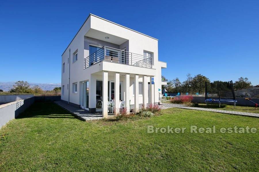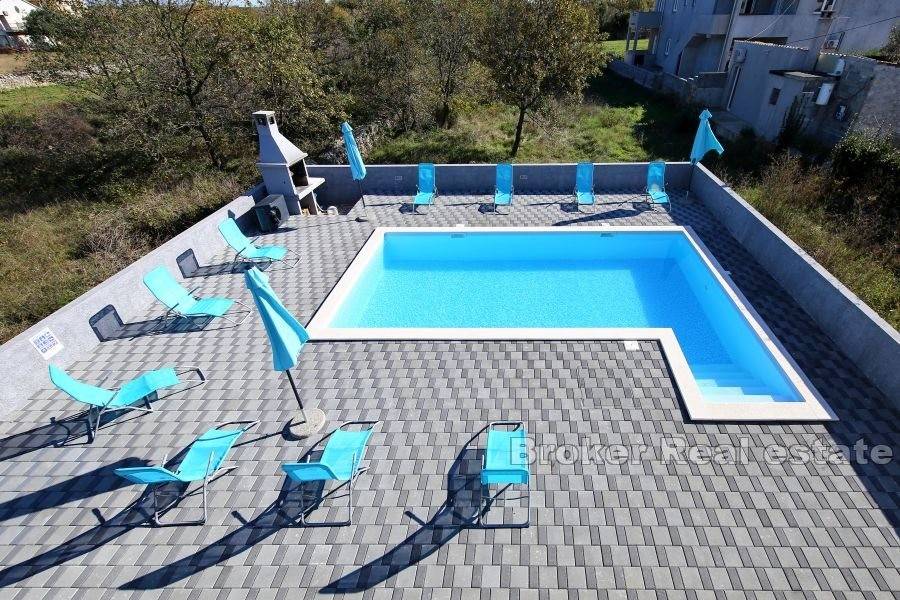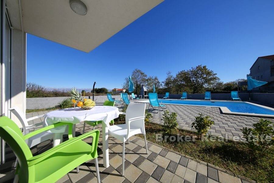 A modern, beautifully decorated house near Zadar is for sale. The house is located only about 15 kilometers from the center of Zadar and is located on a plot of land measuring 820 m2. The property has an external parking lot and swimming pool within the garden, while the house itself occupies 240 m2. The house consists of four separate modern apartments. All four apartments are spread over two floors, the ground floor and the first floor, and have a separate entrance. All apartments consist of a kitchen and dining room, a bedroom and a bathroom. Two apartments have two bedrooms, while the other two have one each. All apartments are equipped with air conditioning units for the heating and cooling system. The apartments are modernly furnished and are currently rented and used for tourist purposes. For the last few years, the apartments have had excellent business and seasonal success. For this reason, this property is an excellent opportunity for investment and continuation of business.