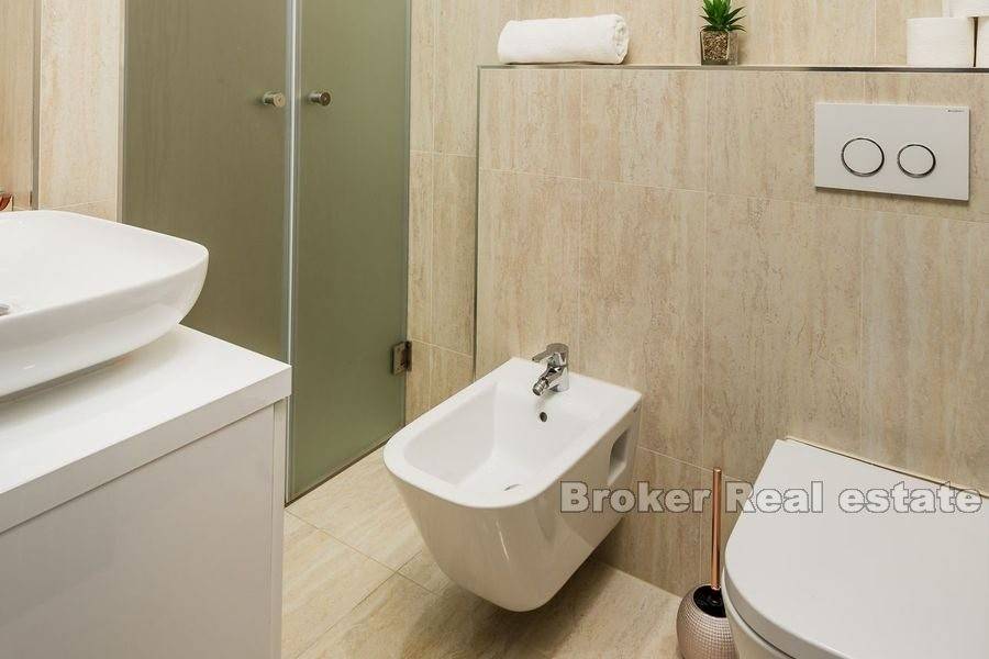 On the minus floor there is a basement, bathroom, boiler room, bathroom, garage with two parking spaces and an additional 2 rooms that can be converted into bedrooms. In addition to the garage, the outside of the house is spacious enough for a minimum of 2 parking spaces. On the ground floor there is a kitchen, dining room, living room and bedroom with private bathroom. From the living room there is a direct exit to the terrace with a summer kitchen of 45m2. The first floor is dominated by 3 bedrooms, one of which has its own bathroom and the other two have a shared bathroom. There is an exit to a large covered terrace, to which two bedrooms have access. On the second floor of the house there is a sauna and an additional entrance hall that can be converted to tenants liking. On the same floor, on a partially covered terrace, there is a jacuzzi, furniture and a sun deck, which can be enjoyed with a view of the sea that is located nearby. Almost all floors offer a view of the sea, which is only 200 meters from the property.
