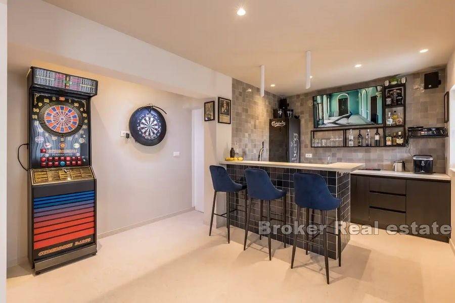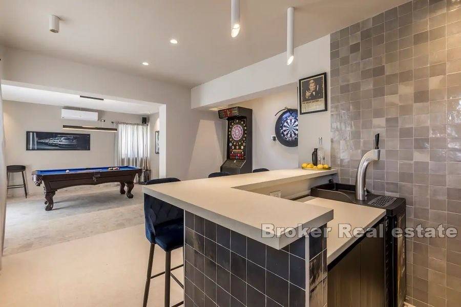 On the ground floor there is an entertainment room equipped with a kitchen with a bar, darts, billiards, a cinema room, one bathroom and a room with a Finnish sauna.