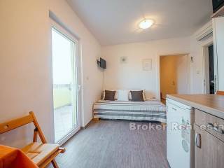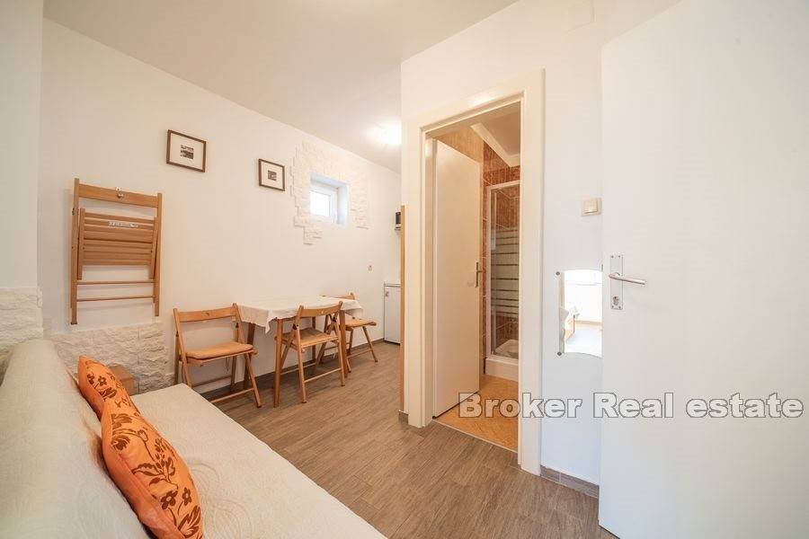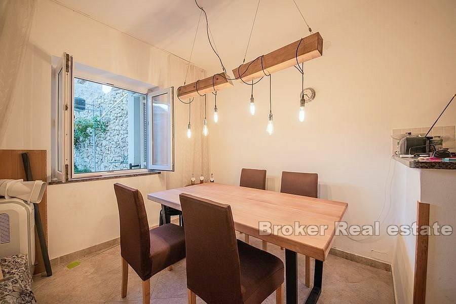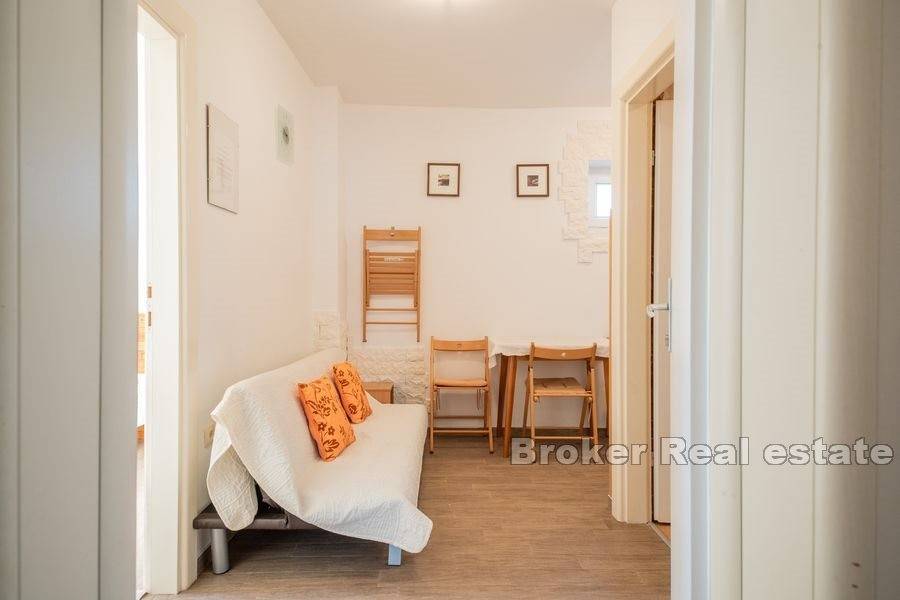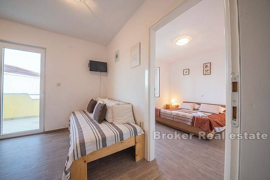 The house belongs to a semi-detached house, consists of 3 apartments spread over two floors, ground floor and first floor. The ground floor is arranged as one apartment, which includes a kitchen, bathroom and two bedrooms, while on the 1st floor the space is divided into two apartments, symmetrical floor plan with a total of two kitchens, two bedrooms, two bathrooms, balcony and terrace. The apartments on the 1st floor are accessed by an external staircase.