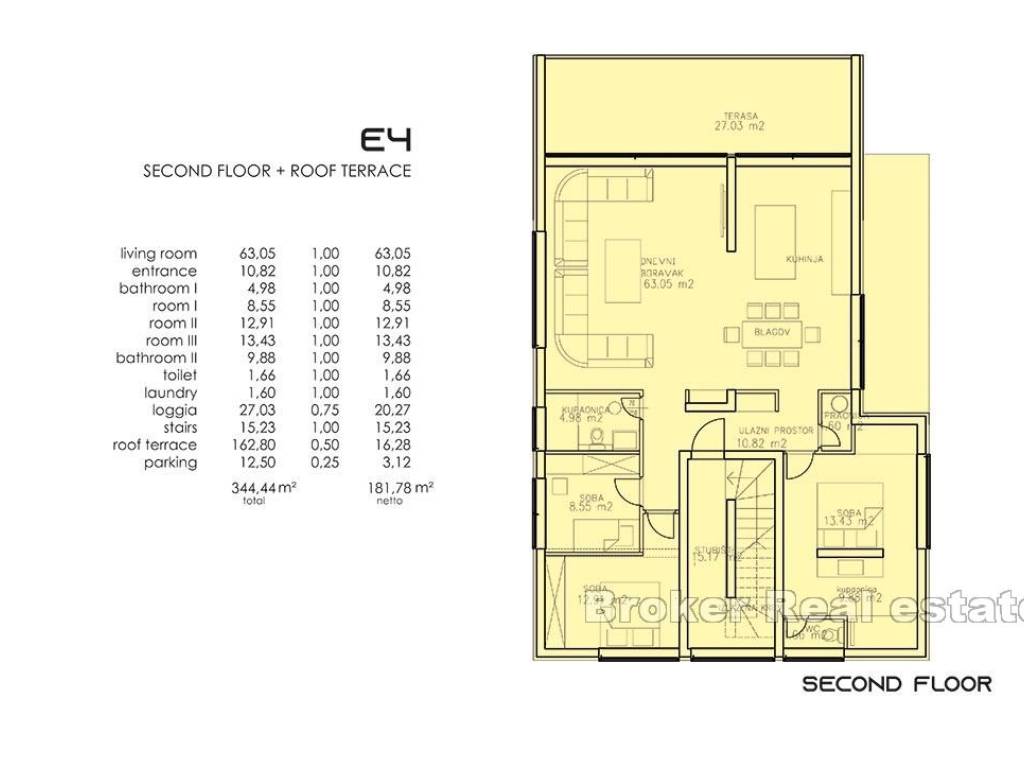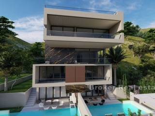 From the living room there is access to a covered terrace of approximately 34m2 which provides an impressive open sea view. The apartment has one parking space. The apartment on the second floor of 220m2 consists of an open concept kitchen, dining room and living room with access to a covered terrace, one bathroom, toilet, pantry and