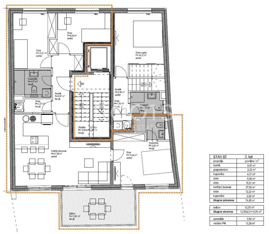 Stan S5 - četverosoban stan na trećem katu, ujedno i jedini stan na etaži, zatvorene površine 74,8 m2 s natkrivenim balkonom 12 m2, spremištem 3,73 m2 i vanjskim parkirnim mjestom.
