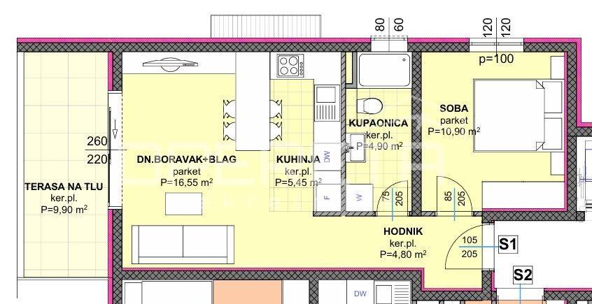 The layout is highly functional and easy to furnish, with an entrance hallway leading into a spacious open-plan living area connected to the kitchen and dining area, with access to the terrace. The bedroom is discreetly separated by a small hallway, providing additional privacy and comfort. The building is constructed with reinforced concrete, fitted with PVC-aluminium joinery and quality brick partition walls, while the finishing works are planned using modern and durable materials, including bathrooms equipped with high-quality ceramics and higher-class sanitary ware. The building comprises a total of 35 apartments. The purchase of an outdoor parking space is mandatory, while garage spaces are available as an optional purchase.