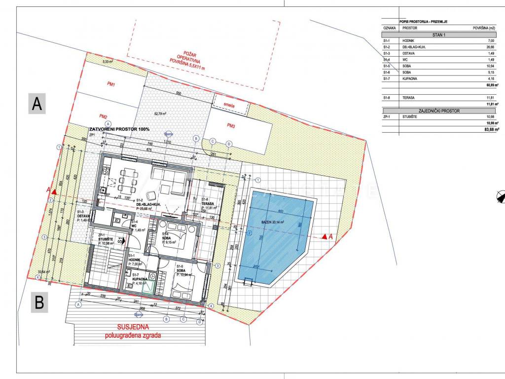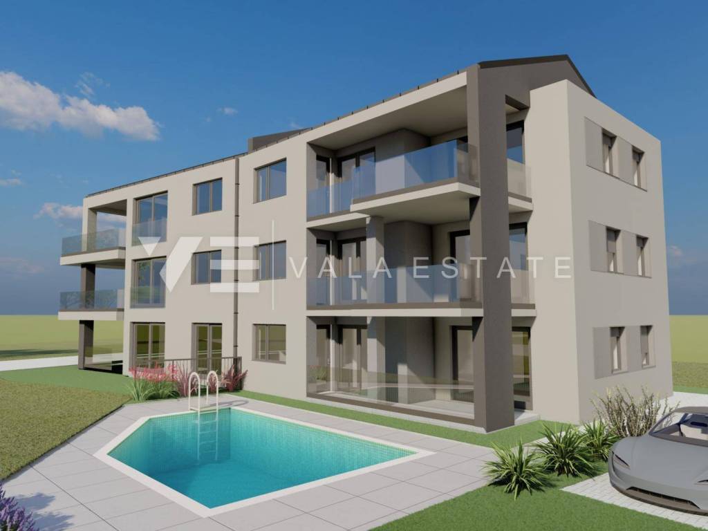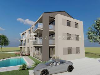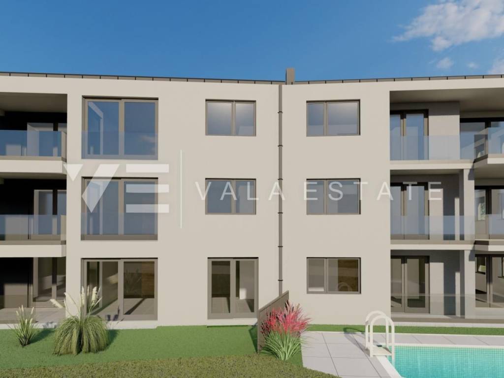 Real Estate Island of Krk, Šilo - for sale is an apartment with an excellent layout on the ground floor of a new building in a prime location just 450 m from beautiful beaches and the center with all necessary amenities. The apartment has a living area of 72,70 m2 and consists of an entrance area, two bedrooms, bathroom, kitchen, dining room and living room with access to a covered terrace and a 25 m2 garden with a shared swimming pool. It has one parking space in the courtyard of the building. Quality materials and equipment were used for construction, including ceramic floor coverings, quality sanitary ware, underfloor heating, air conditioning and high-quality PVC joinery. The property is currently under construction, and the planned completion is expected by the end of 2027. The apartment is subject to VAT and the buyer does not pay real estate tax.