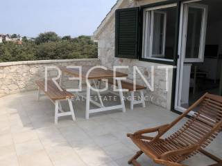 A stone house in an authentic Mediterranean style is for sale, situated on a plot of 357 m², offering a perfect blend of privacy, comfort, and elegance. The total living area of the house is 162.86 m², and a spacious garage of 41.79 m² adds additional value. This property represents an ideal opportunity for a peaceful family life, but also an exceptional investment for tourist rental thanks to the pool, spacious terraces, and enchanting panoramic sea view. The house is built in a traditional stone style that exudes warmth and Mediterranean charm, while the contemporary layout of the rooms ensures maximum functionality and comfort. On the ground floor, there is a spacious living room with a kitchen and dining area of 28.60 m², which forms the central part of the home and is an ideal place for family gatherings. On the same floor, there are two bedrooms, including one of approximately 9 m², and the other 8.91 m², a bathroom, a communication area with a staircase, and a terrace that allows for a pleasant stay outdoors and enjoying the fresh air. On the first floor, there is an additional living room with a kitchen, bedrooms, and a bathroom, which makes this property suitable for two separate residential units or a larger family. From the first floor, you can access a spacious terrace of approximately 22 m², which offers a spectacular, open panoramic view of the sea and the surrounding landscape. Large glass surfaces allow for an abundance of natural light throughout the day, creating a sense of spaciousness and connection with nature. The floor coverings are a combination of high-quality ceramic tiles and parquet, achieving a perfect balance between elegance and the warmth of the home. Every detail has been carefully designed to provide durability, aesthetic value, and maximum living comfort. The landscaped garden offers a private pool that becomes the central place for relaxation during warm summer days. The area around the pool is designed for a sunbathing area and a zone for socializing, creating a true small oasis of peace. The garage of 41.79 m² allows for safe parking of vehicles and additional storage space. The property is located in a quiet and attractive location that provides complete privacy and at the same time allows proximity to all necessary amenities. The panoramic sea view, which extends from the terraces and outdoor space, gives this house a special exclusivity and makes it a true Mediterranean gem. The house is finished and ready to move in, and it is built with quality materials with an emphasis on durability, aesthetics, and a pleasant living atmosphere.