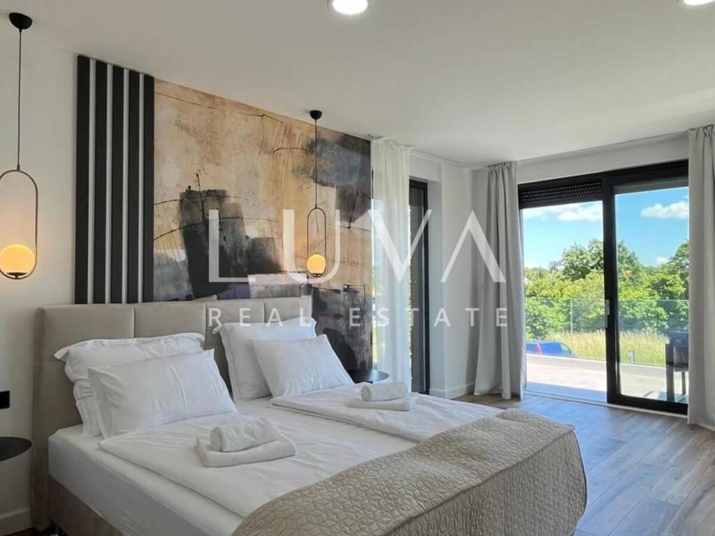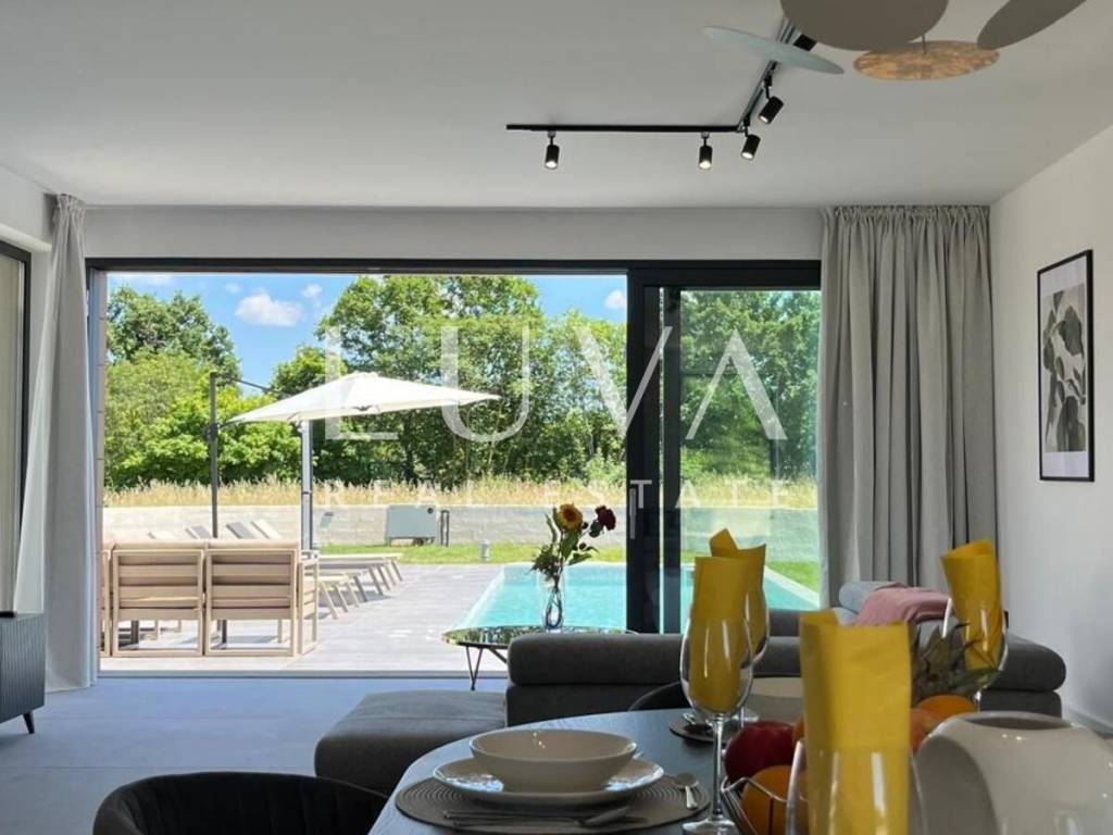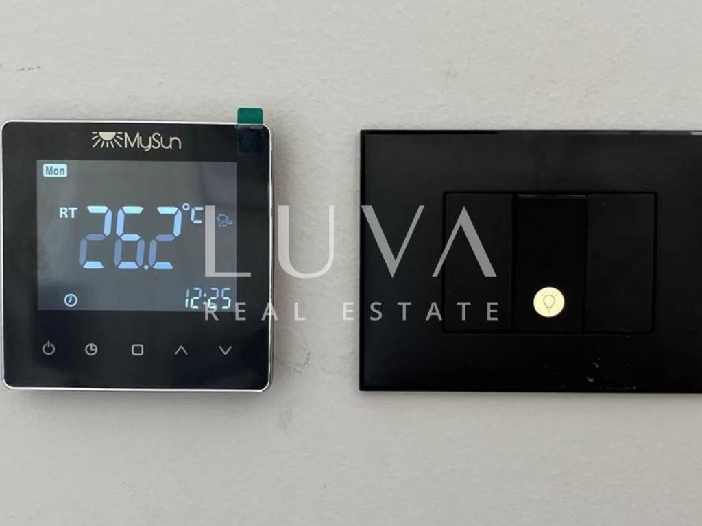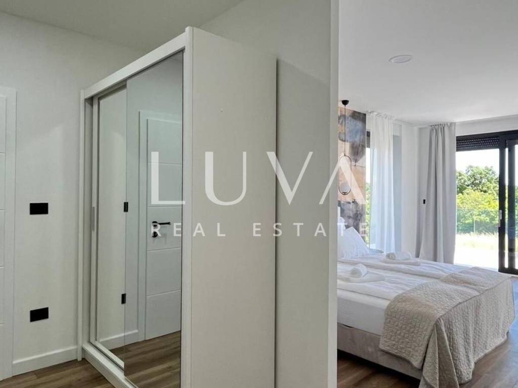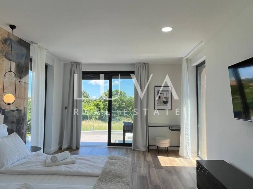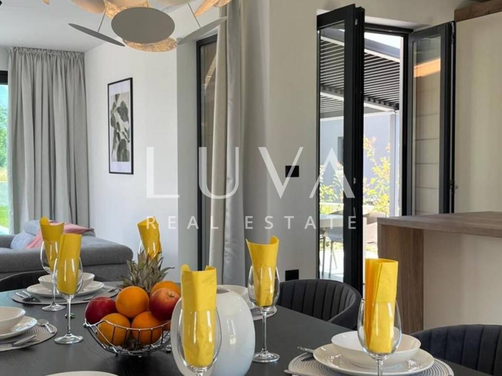The villa is equipped with state-of-the-art technological solutions including underfloor heating in bathrooms, kitchen, and living room, and a multi-split heating and cooling system in all rooms. Premium aluminum joinery with lift-and-slide walls and electric aluminum shutters in bedrooms is installed. The facade features Swisspearl vintago cladding, and for additional energy efficiency, a solar panel for hot water with a 200-liter tank is installed. The property has a bio septic tank and is prepared for video surveillance and alarm system installation.