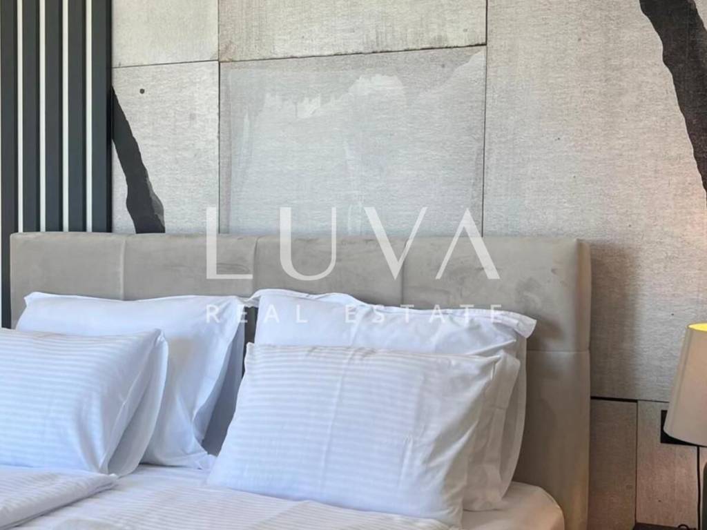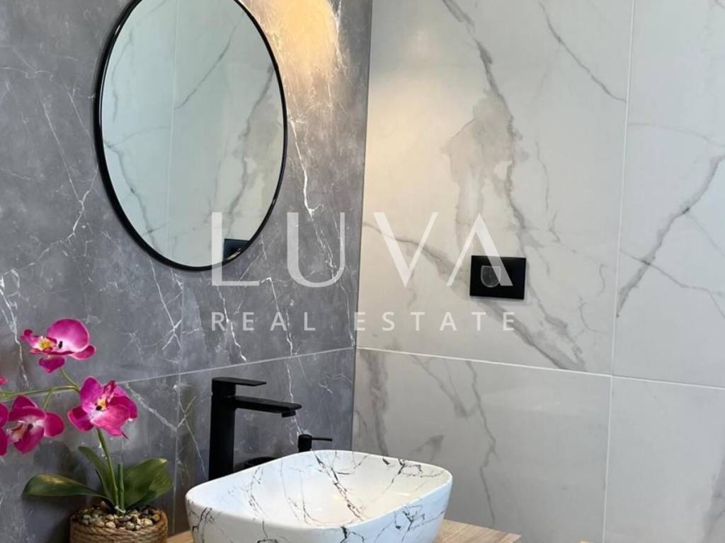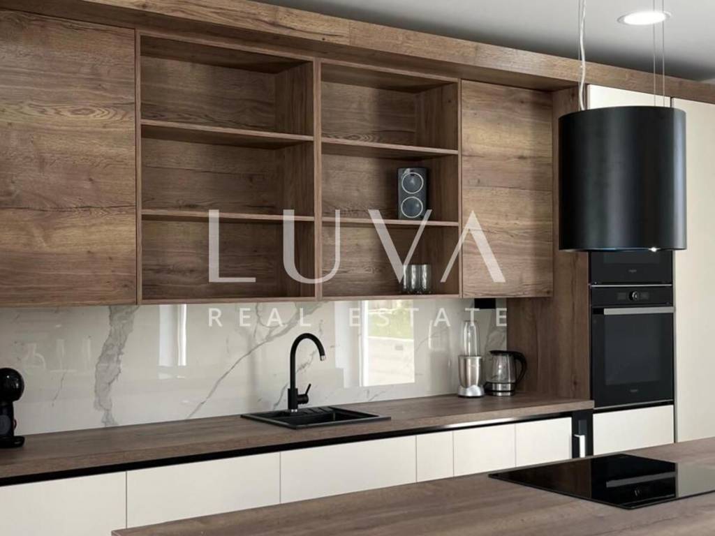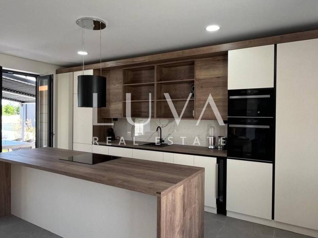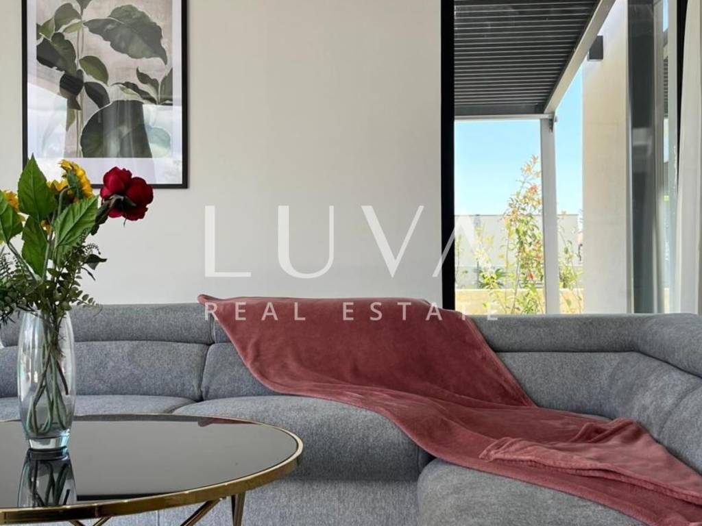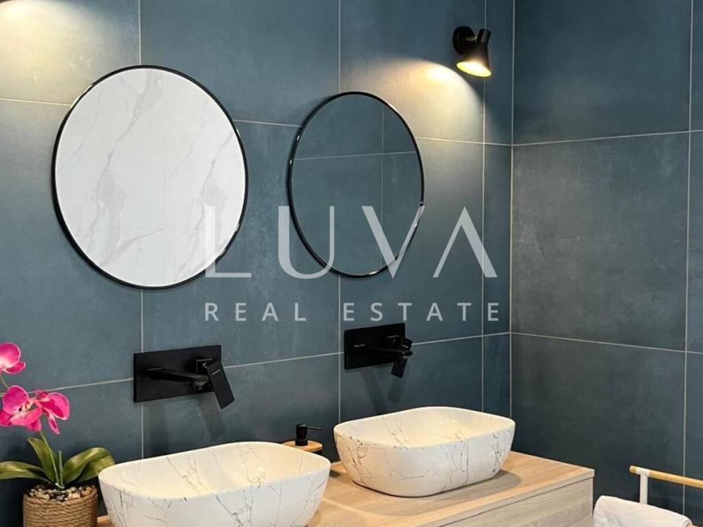 The villa's interior exudes elegance and luxury, furnished with designer furniture and custom-made elements. The Austrian Dan Kuchen kitchen stands out, equipped with premium Whirlpool electrical appliances. The rooms are enhanced with prestigious Italian ceramic tiles By Mirage, while the doors are custom-made from MDF.