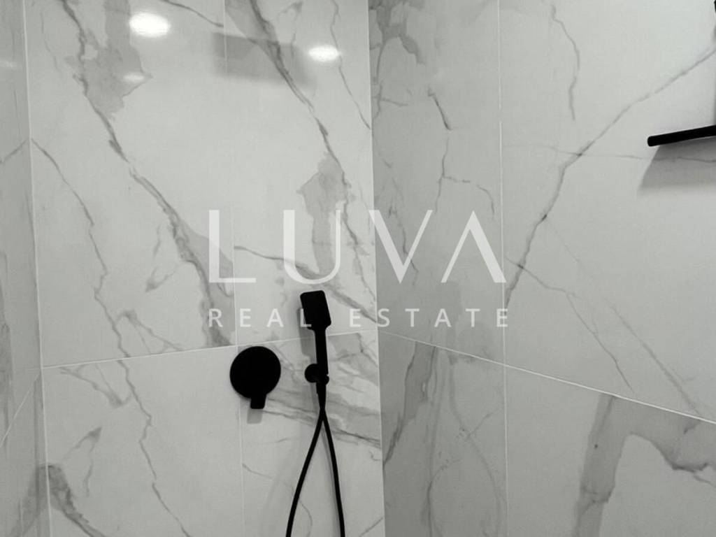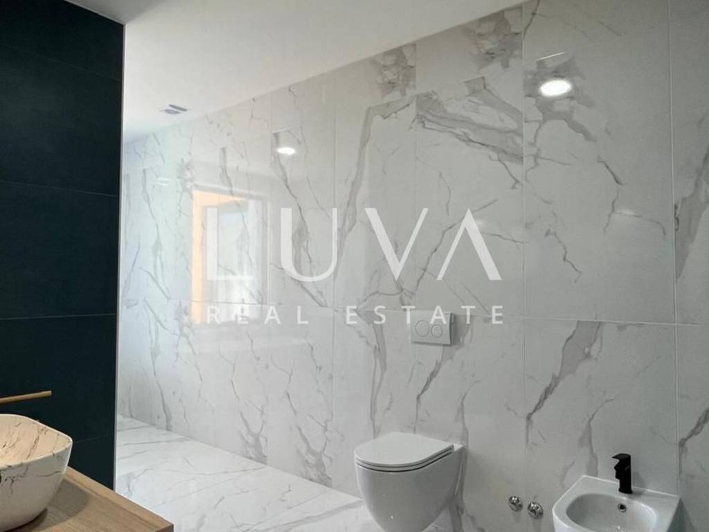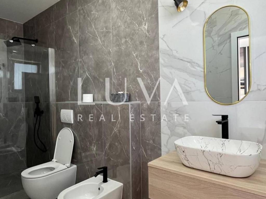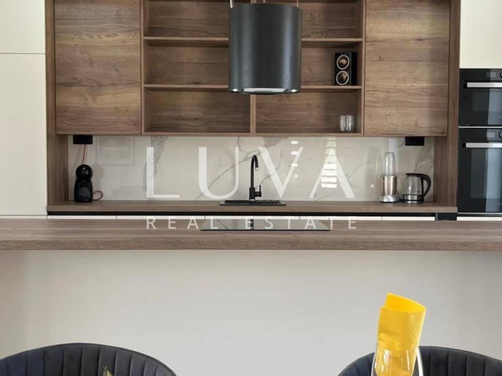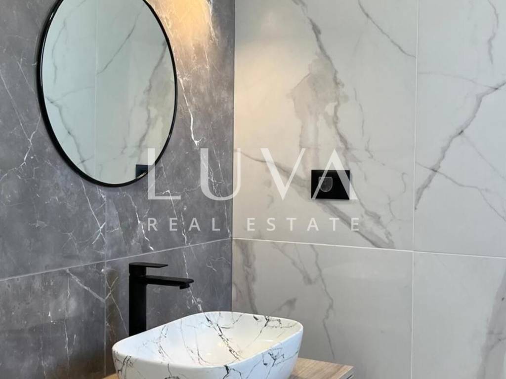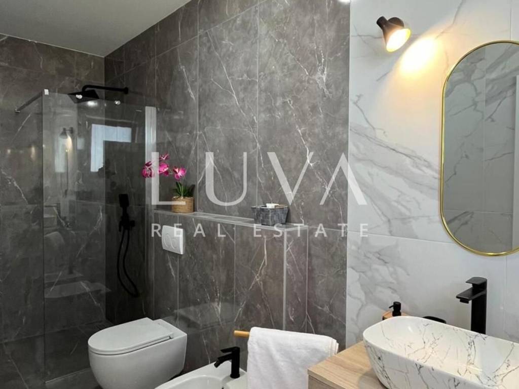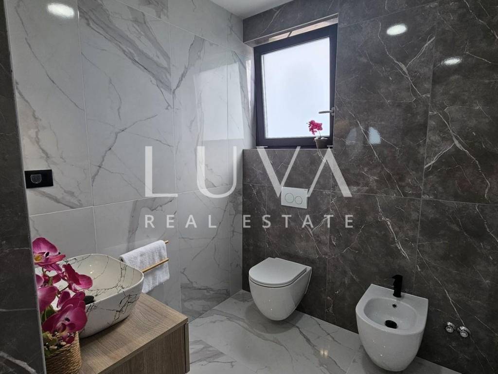 The villa's interior exudes elegance and luxury, furnished with designer furniture and custom-made elements. The Austrian Dan Kuchen kitchen stands out, equipped with premium Whirlpool electrical appliances. The rooms are enhanced with prestigious Italian ceramic tiles By Mirage, while the doors are custom-made from MDF.