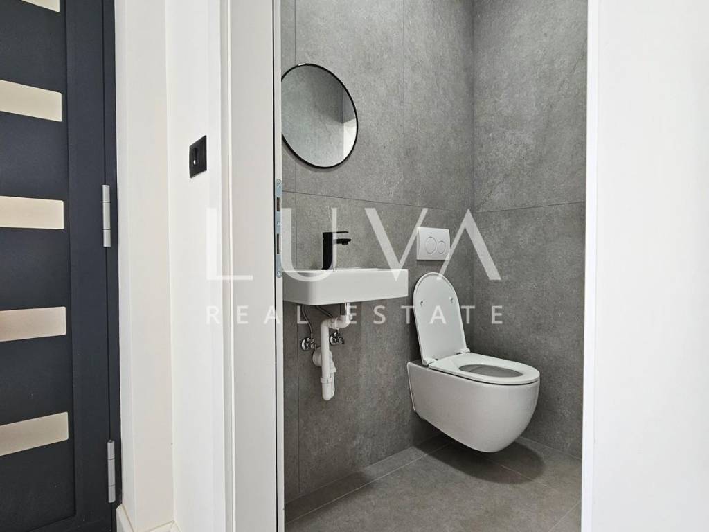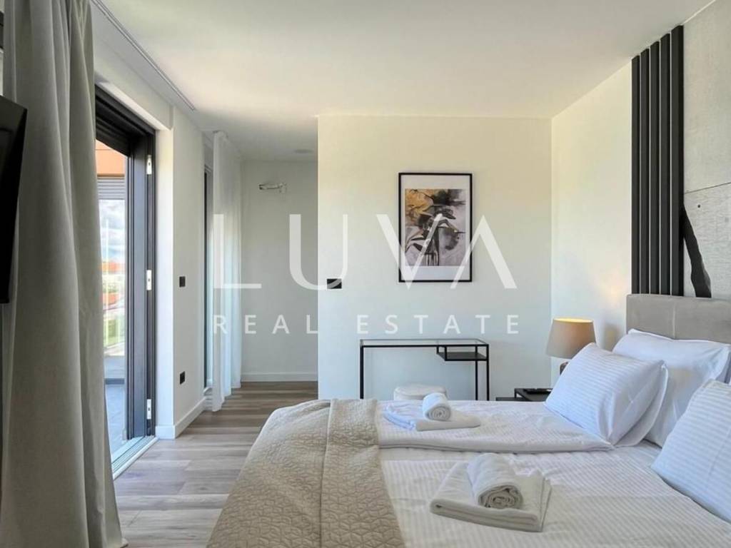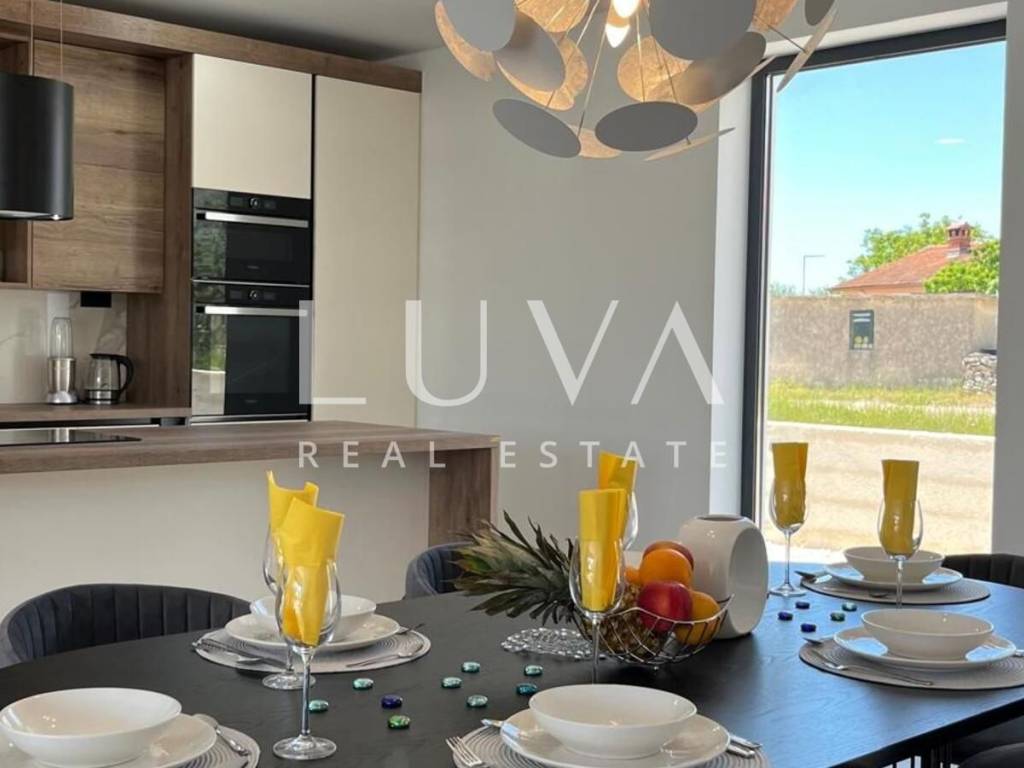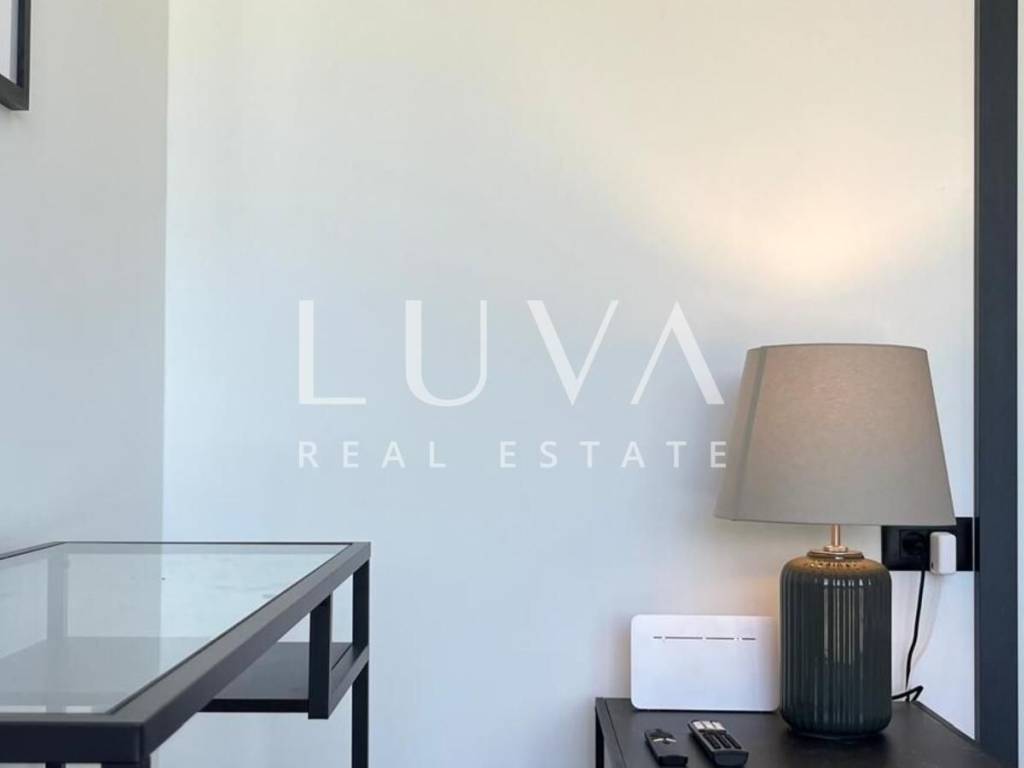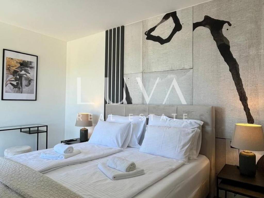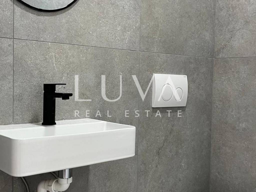 The villa's interior exudes elegance and luxury, furnished with designer furniture and custom-made elements. The Austrian Dan Kuchen kitchen stands out, equipped with premium Whirlpool electrical appliances. The rooms are enhanced with prestigious Italian ceramic tiles By Mirage, while the doors are custom-made from MDF.
