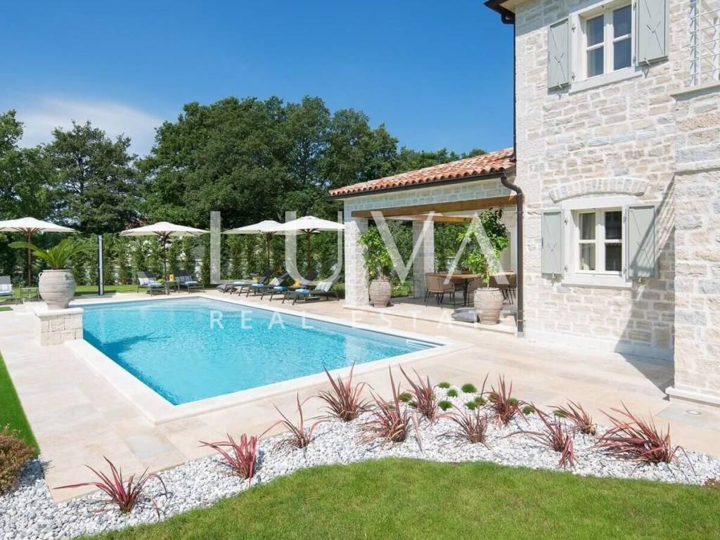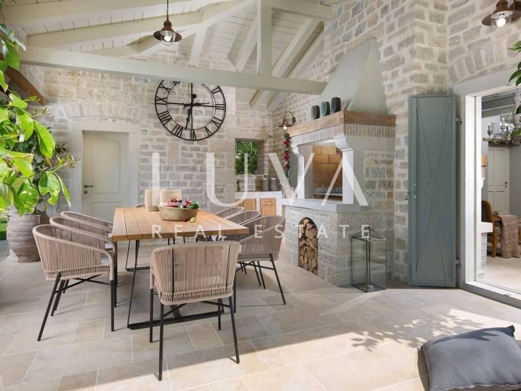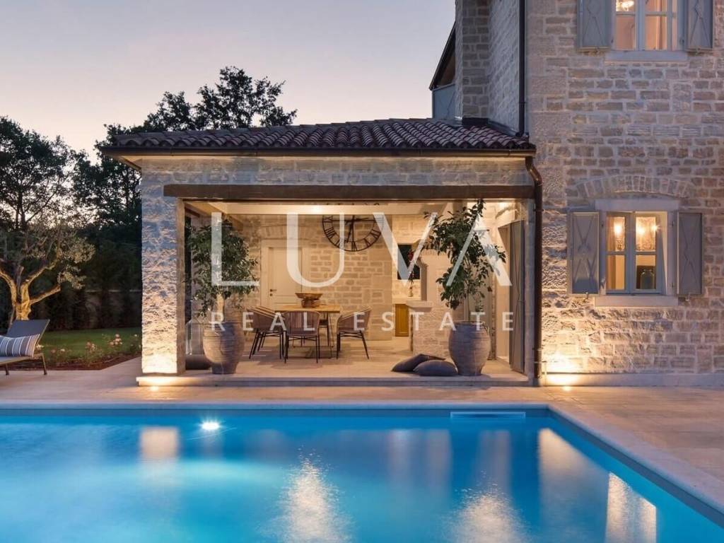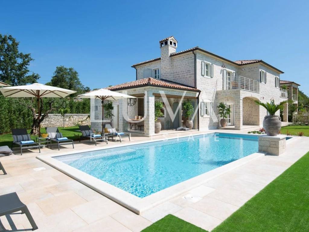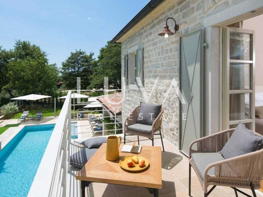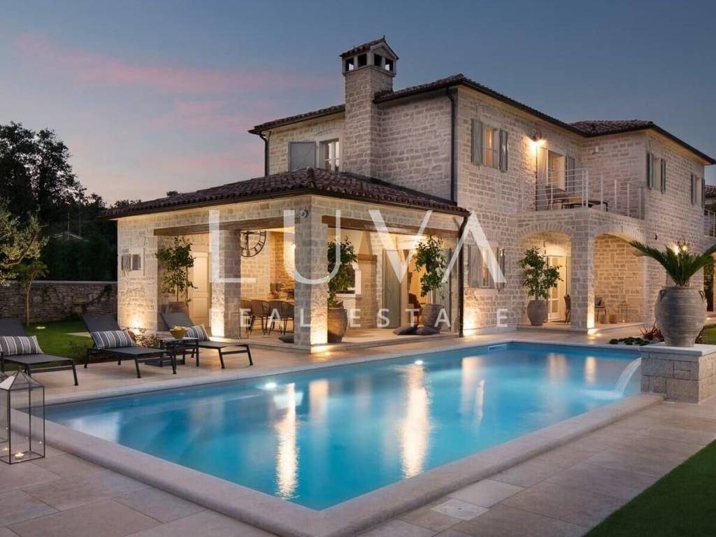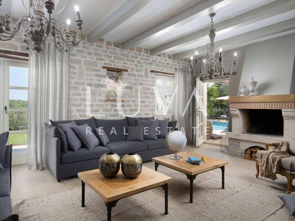 For sale: Luxury villa with a pool in the quiet village of Ladići near Kanfanar. Kanfanar is well-connected via the Istrian highway, and the famous town of Rovinj is nearby. Other notable cities such as Poreč, Novigrad, and Vrsar are also close. This luxury villa, built in 2016, has an area of 359 m² and spans two floors. It is part of a complex of luxury villas with shared sports courts and a children's playground. The villa is built in a traditional Istrian style with stone and a sloped tile roof. The interior features traditional elements with stone walls, wooden beams, and rustic wooden furniture. On the ground floor, there is a spacious living room with a charming fireplace, a fully equipped kitchen with designer appliances, and a large dining table. In front of the house, there is an outdoor pool, and next to it, a covered terrace with a barbecue and a dining table. The villa has 4 bedrooms, each with its own bathroom, and is sold fully furnished and equipped. It has been successfully rented out for tourism for several years, and its sister villas are also for sale, offering a great investment opportunity in Croatian tourism.