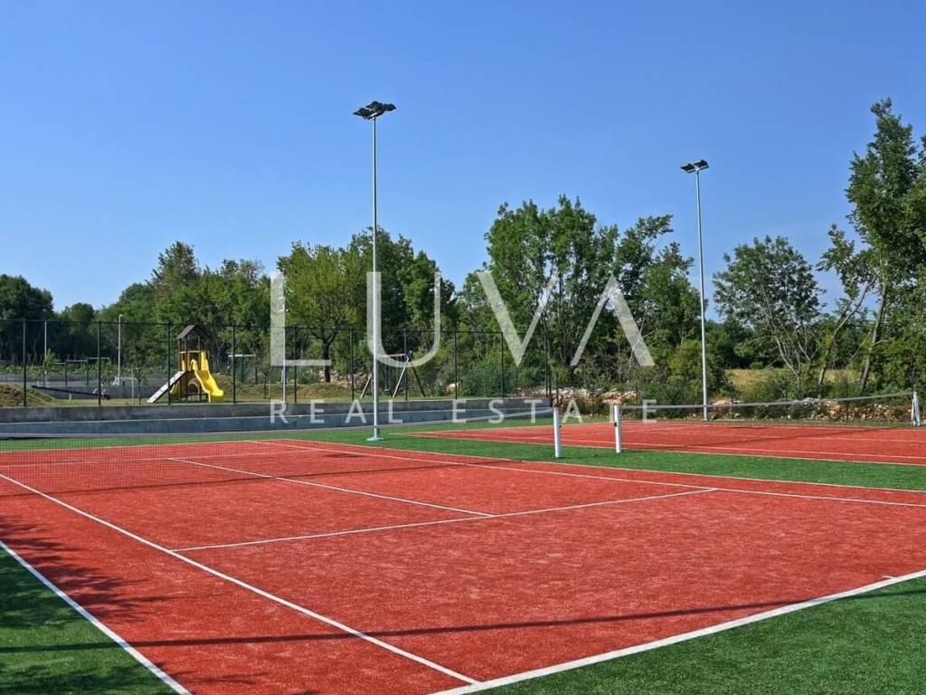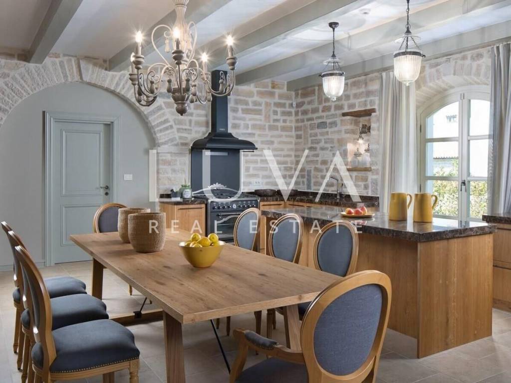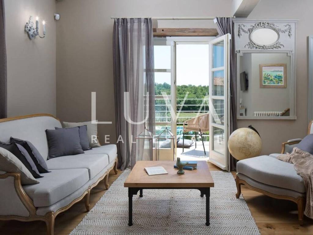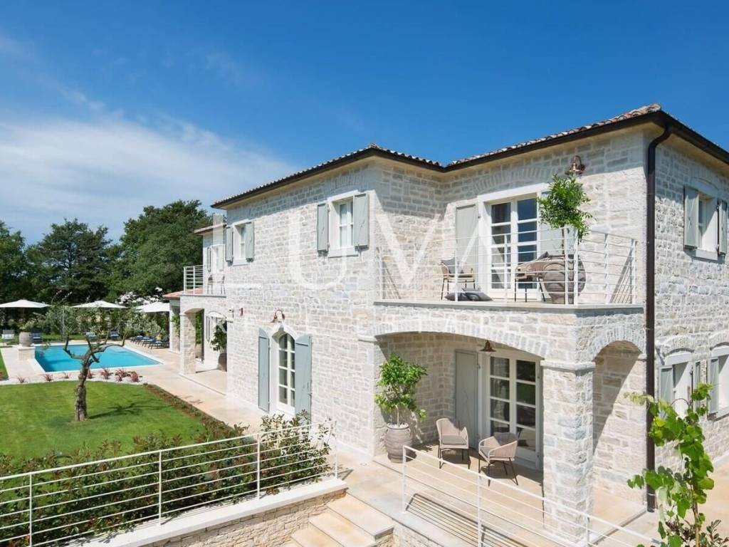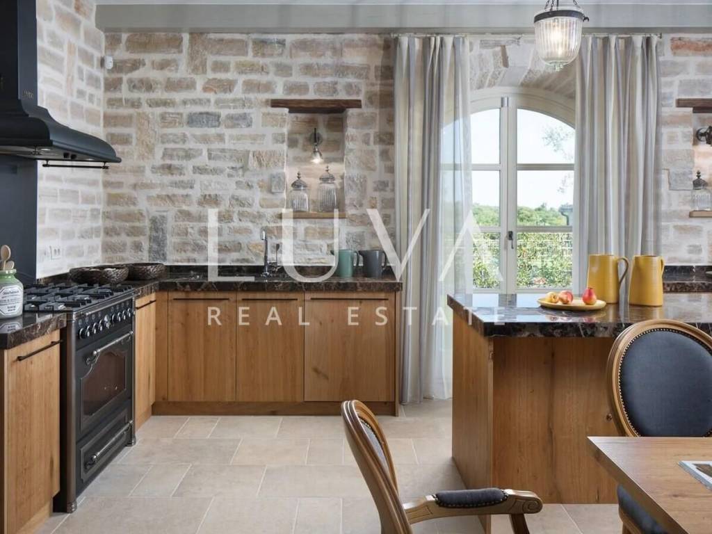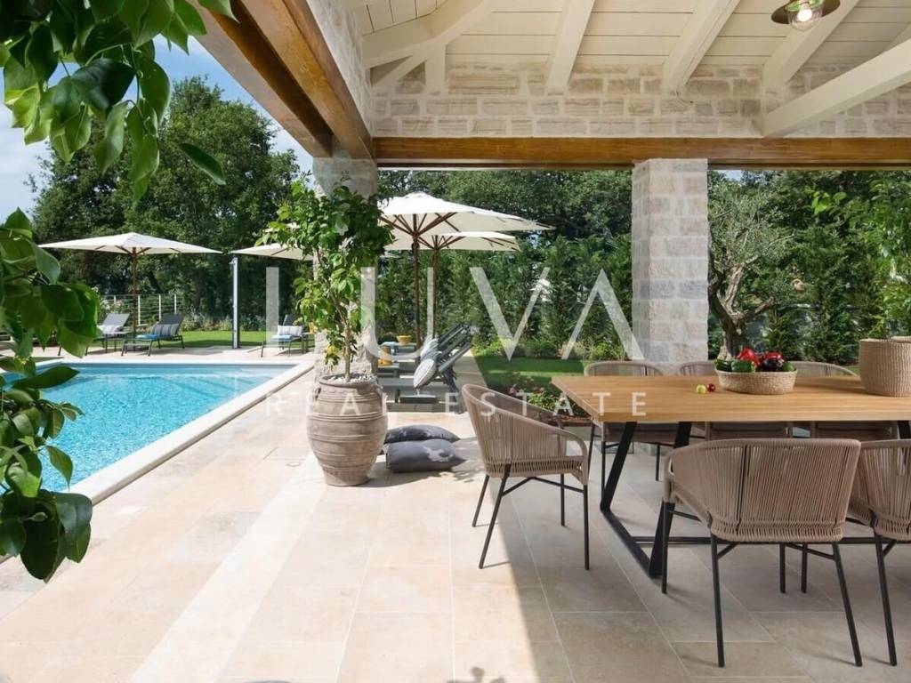For sale: Luxury villa with a pool in the quiet village of Ladići near Kanfanar. Kanfanar is well-connected via the Istrian highway, and the famous town of Rovinj is nearby. Other notable cities such as Poreč, Novigrad, and Vrsar are also close. This luxury villa, built in 2016, has an area of 359 m² and spans two floors. It is part of a complex of luxury villas with shared sports courts and a children's playground. The villa is built in a traditional Istrian style with stone and a sloped tile roof. The interior features traditional elements with stone walls, wooden beams, and rustic wooden furniture. On the ground floor, there is a spacious living room with a charming fireplace, a fully equipped kitchen with designer appliances, and a large dining table. In front of the house, there is an outdoor pool, and next to it, a covered terrace with a barbecue and a dining table. The villa has 4 bedrooms, each with its own bathroom, and is sold fully furnished and equipped. It has been successfully rented out for tourism for several years, and its sister villas are also for sale, offering a great investment opportunity in Croatian tourism.