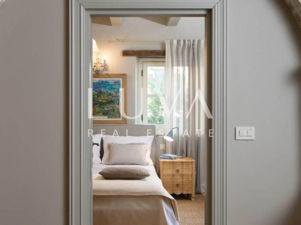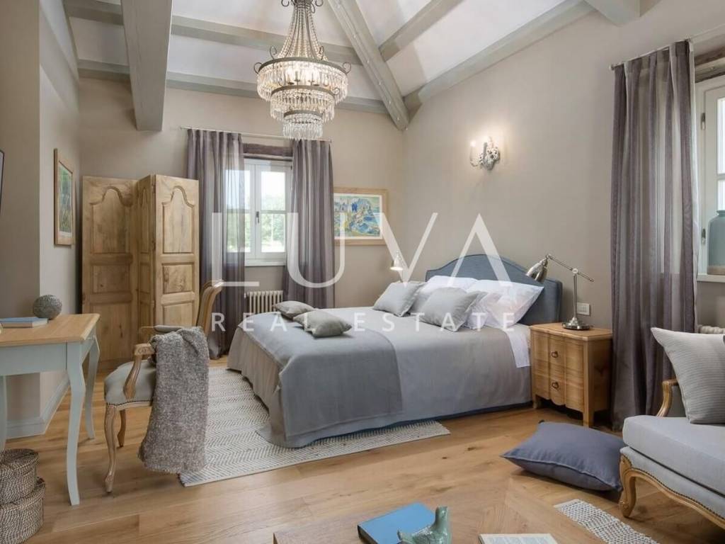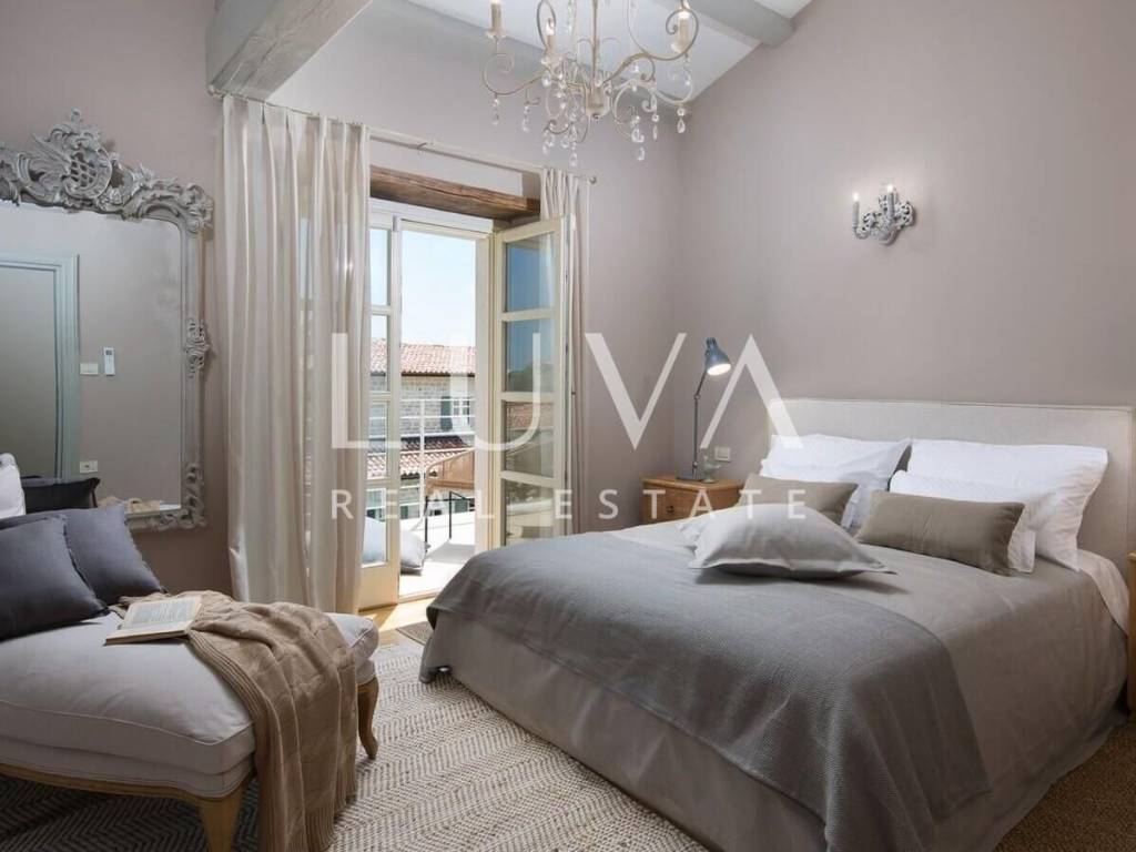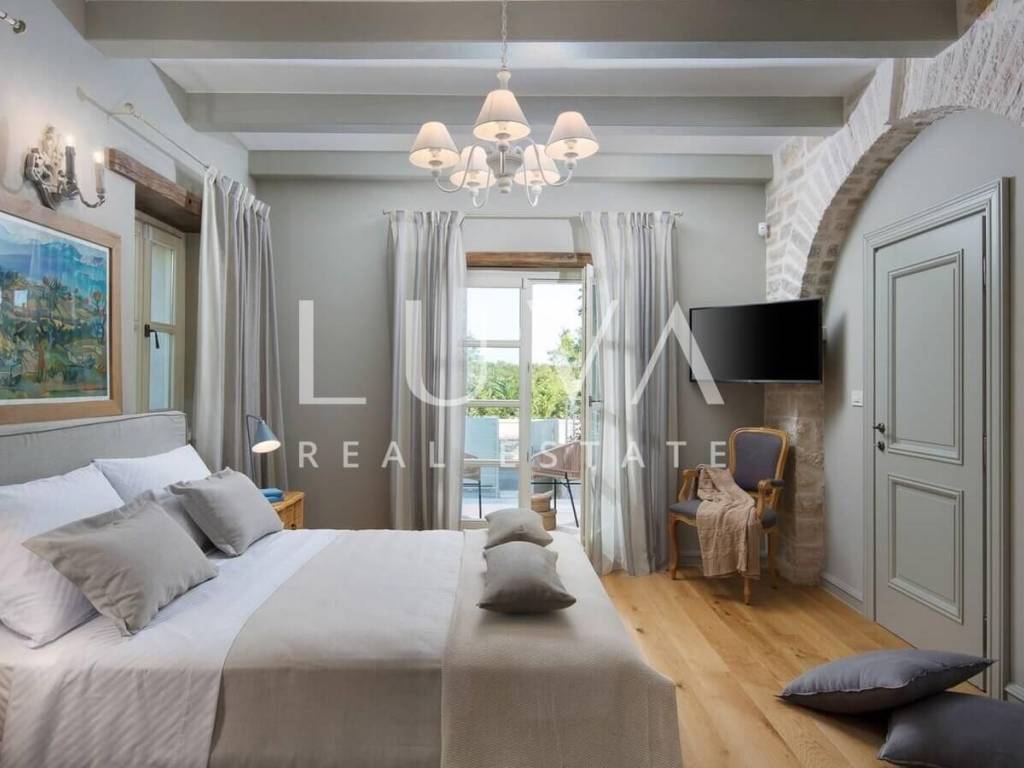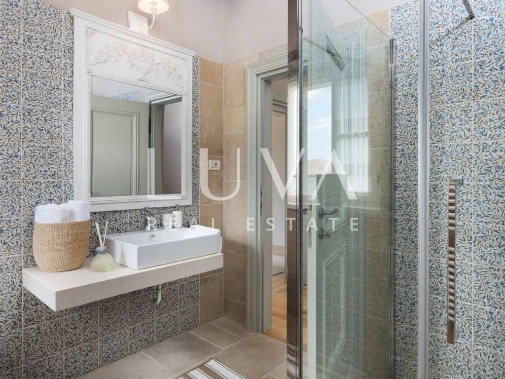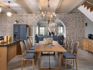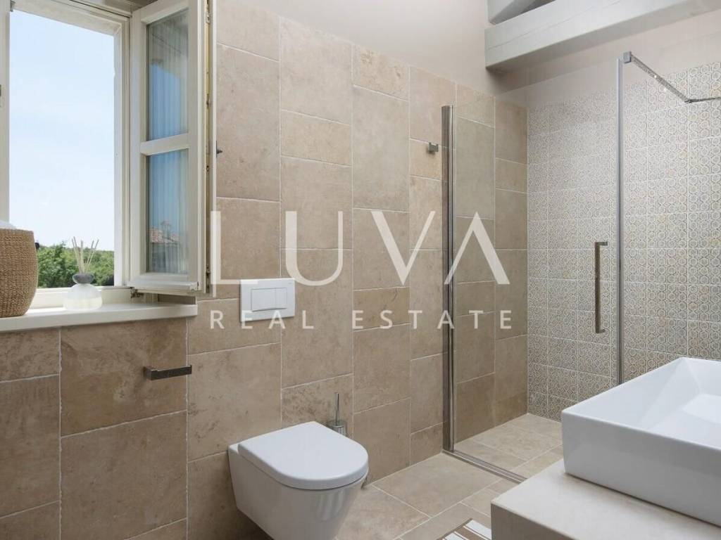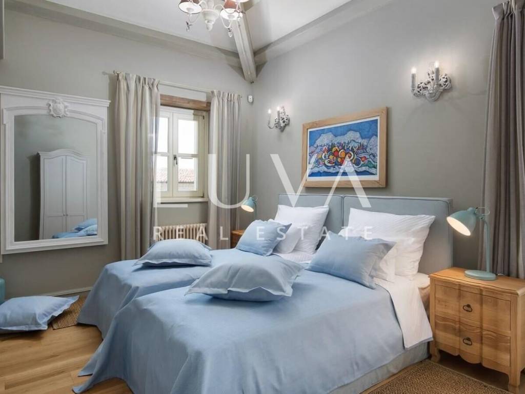 For sale: Luxury villa with a pool in the quiet village of Ladići near Kanfanar. Kanfanar is well-connected via the Istrian highway, and the famous town of Rovinj is nearby. Other notable cities such as Poreč, Novigrad, and Vrsar are also close. This luxury villa, built in 2016, has an area of 359 m² and spans two floors. It is part of a complex of luxury villas with shared sports courts and a children's playground. The villa is built in a traditional Istrian style with stone and a sloped tile roof. The interior features traditional elements with stone walls, wooden beams, and rustic wooden furniture. On the ground floor, there is a spacious living room with a charming fireplace, a fully equipped kitchen with designer appliances, and a large dining table. In front of the house, there is an outdoor pool, and next to it, a covered terrace with a barbecue and a dining table. The villa has 4 bedrooms, each with its own bathroom, and is sold fully furnished and equipped. It has been successfully rented out for tourism for several years, and its sister villas are also for sale, offering a great investment opportunity in Croatian tourism.