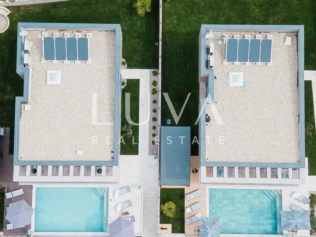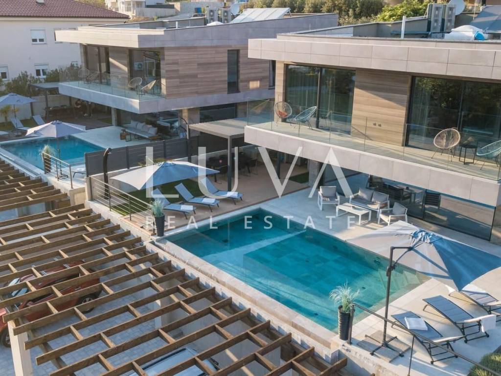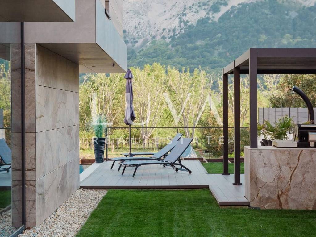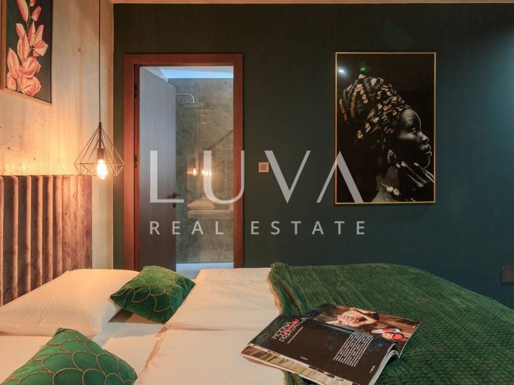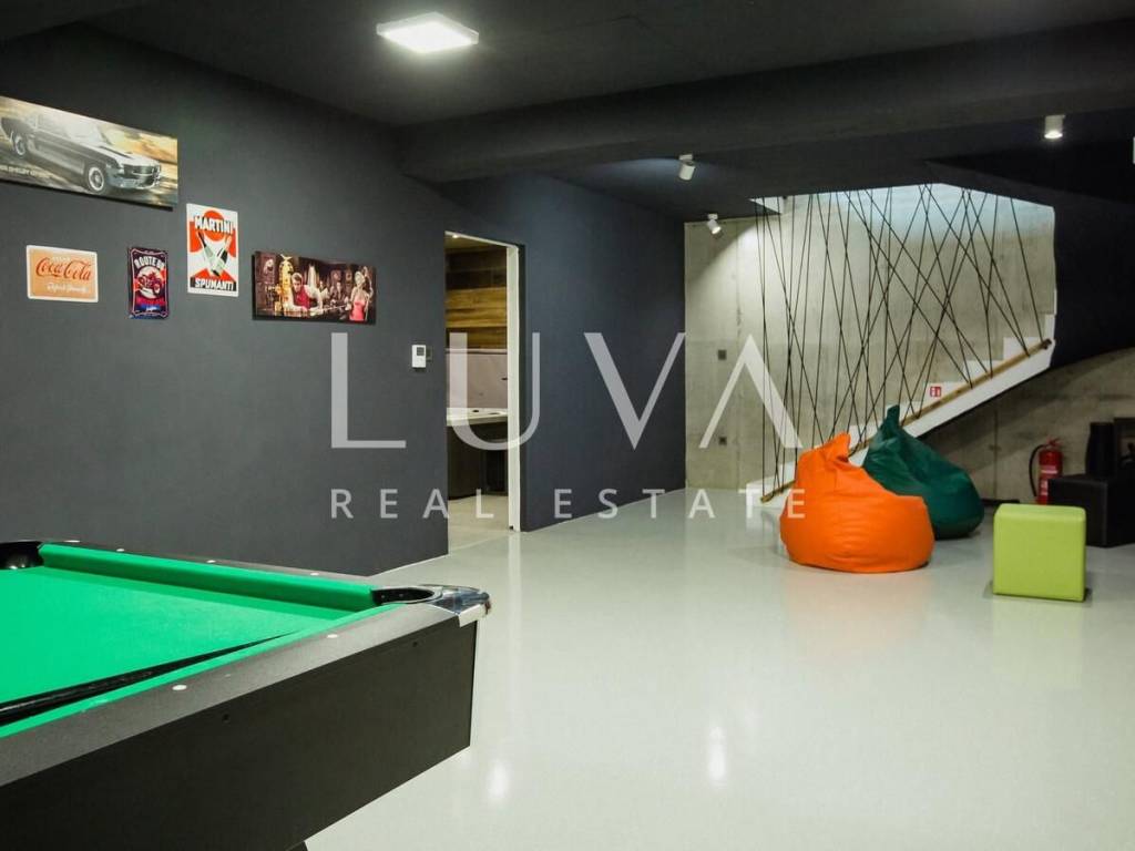 A luxury villa with an area of 280 m² is for sale, located just 500 meters from the sea in Baška, on the island of Krk. The villa spans 2 floors and is situated on a 450 m² property. It has 4 bedrooms with en-suite bathrooms, a spacious living room, a fully equipped kitchen, and a room with a sauna and jacuzzi, with a billiard table in the adjacent room.