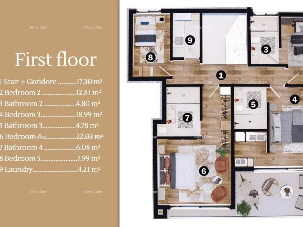 The first floor is accessed by stairs and consists of a hallway, 3 bedrooms, 2 bathrooms, a storage room and a terrace.