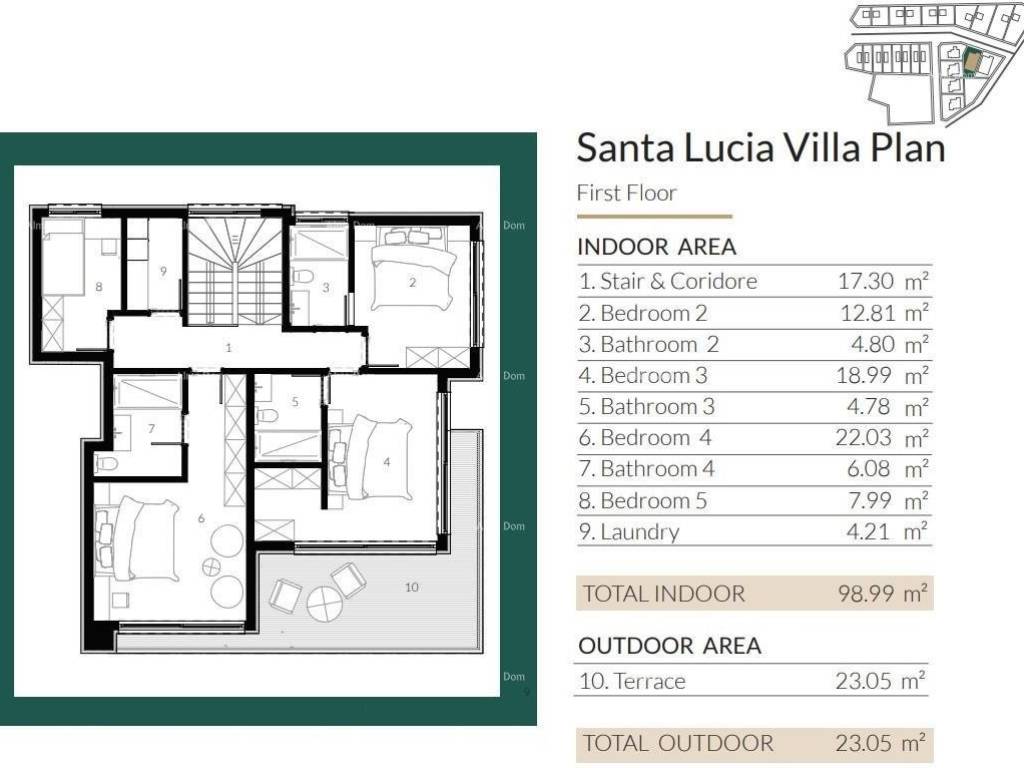 Villa C11, with a total area of 274.16 m2, consists of a ground floor and a first floor. On the ground floor there is a hallway, living room, kitchen with dining room, bathroom, 2 bedrooms, storage room.