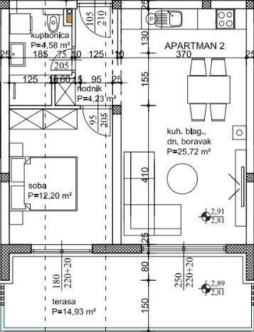 Hallway – 4.23 m² Living room, kitchen and dining area – 25.72 m² Bedroom – 12.20 m² Bathroom – 4.58 m² Terrace – 14.93 m²