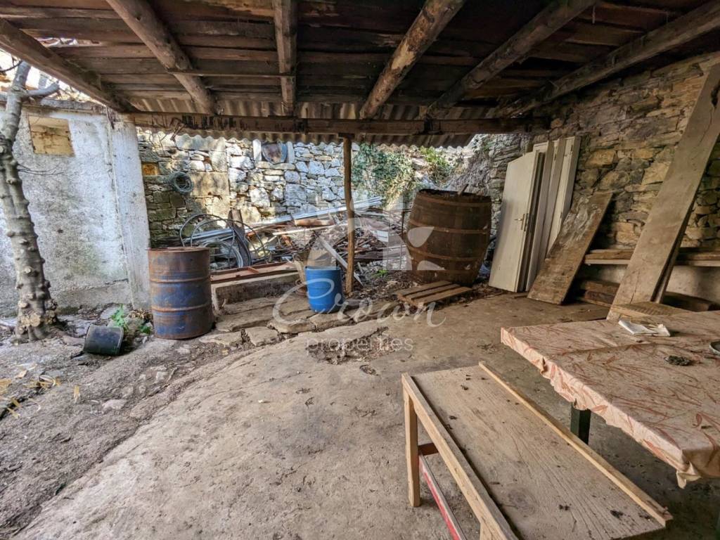 The main stone house has approximately 110 m² arranged over two floors. The ground floor measures about 65 m², while the upper floor has around 45 m². A reinforced concrete slab has been installed on the upper level, as well as an internal staircase. There is an official certificate confirming that the house was built before 1968, which simplifies the renovation process.