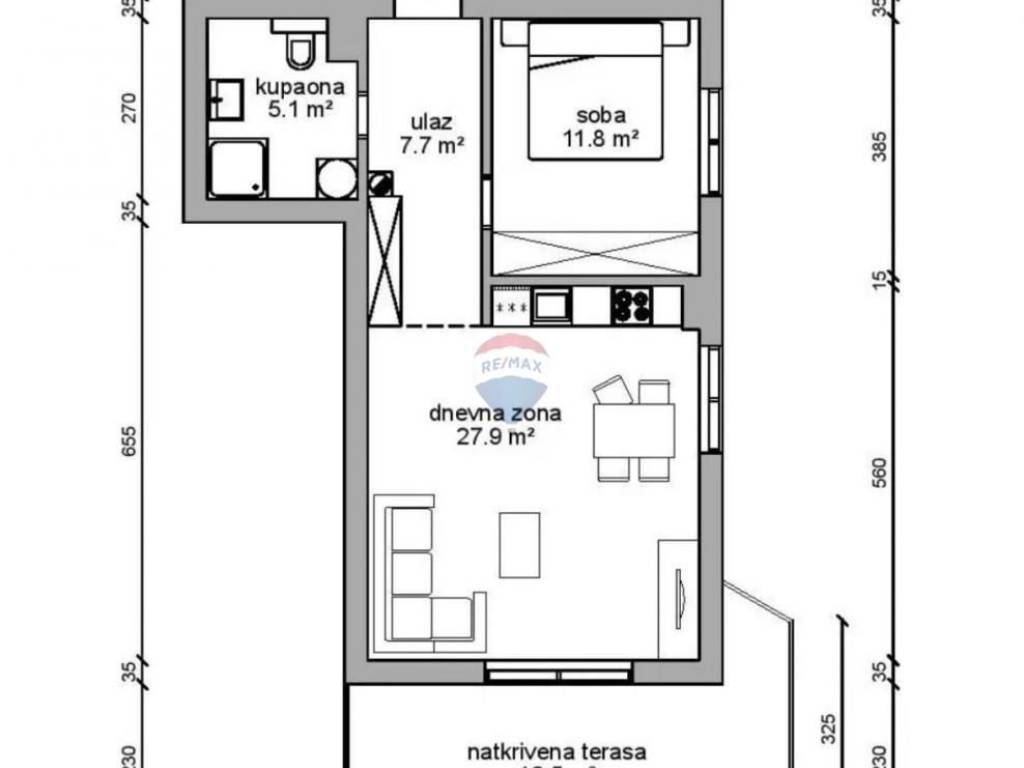 The total area of ​​the apartment, including the terrace, is 64.95 m2, and the apartment consists of: 1 bedroom, living room with kitchen and dining room, bathroom, hallway and a spacious covered terrace facing south with a partial sea view.