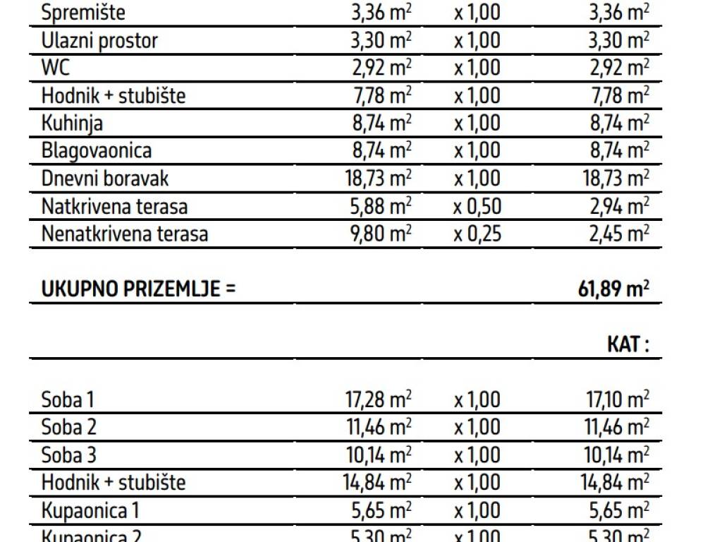 PRIZEMLJE: ulazni trijem, spremište, ulazni prostor, wc, hodnik, stubište, kuhinja, blagovaonica, dnevni boravak, natkrivena terasa površine 5,88 m2 ( neto 2,94 m2), nenatkrivena terasa površine 9,80 m2 ( neto 2,45 m2).