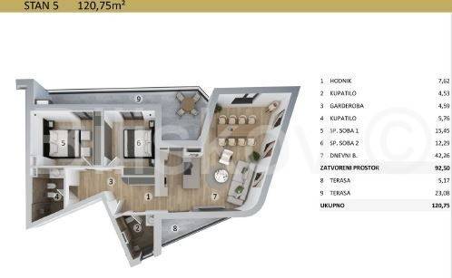 APARTMENT NO. 5: 120.75 m + parking space Price (excl. VAT): 665,000 in instalments or 597,000 for advance payment.