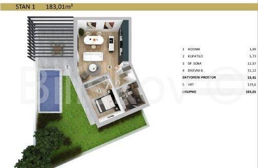 APARTMENT NO. 1: 53.41 m + pool and garden: 129.60 m + parking space Price (excl. VAT): 550,000 in instalments or 495,000 for advance payment.