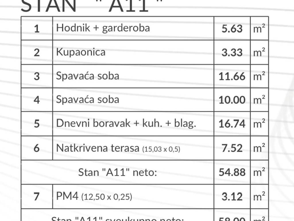 Apartment A11 is located on the 2nd floor of the building and consists of: hallway + wardrobe, living room with kitchen and dining area, 2 bedrooms, bathroom, and covered terrace. The apartment includes one parking space PM4 of 3.12 m2. The apartments will be equipped with inverter air conditioning, underfloor heating in the bathrooms, high-quality ceramics, and flooring.