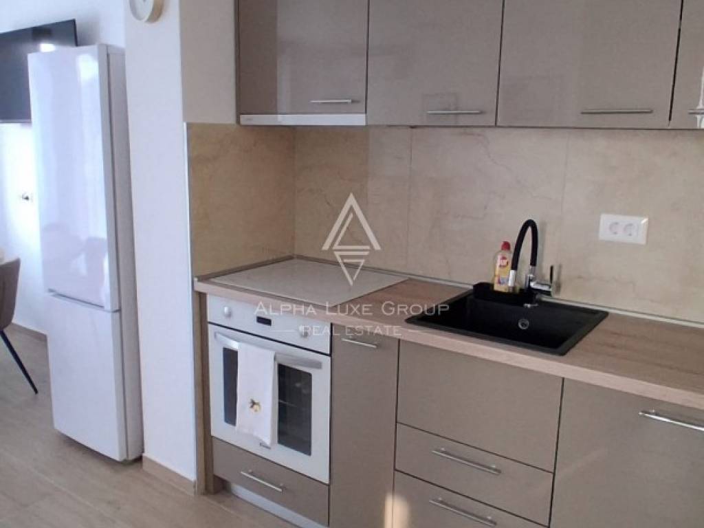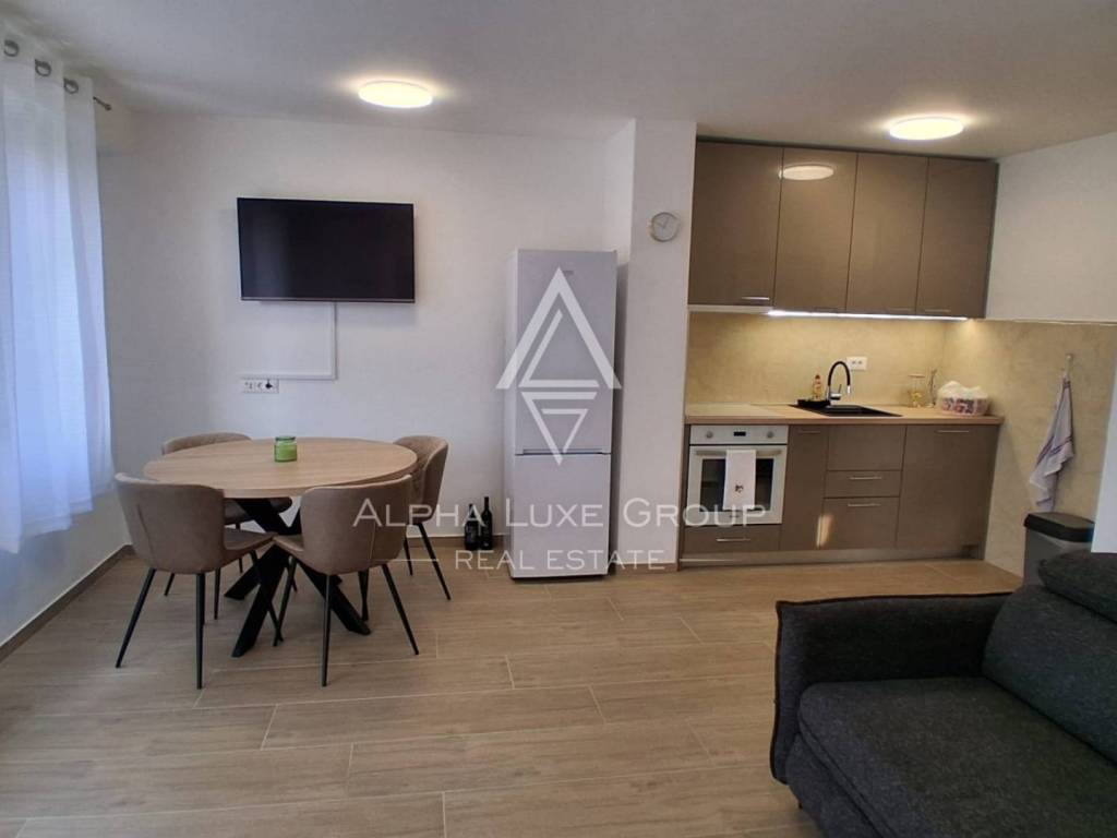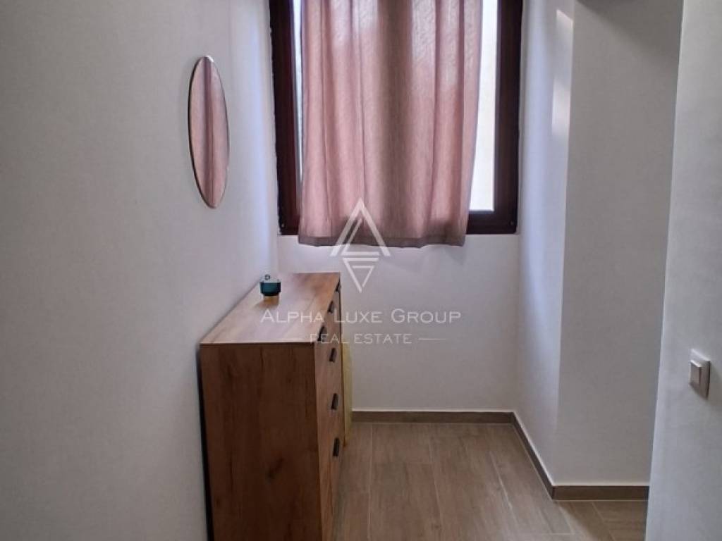 The property was completely renovated in 2025, including new electrical and water installations, new PVC windows, aluminum shutters, modern ceramic flooring, air conditioning unit, and fully updated interior design with new furniture and equipment. The layout includes an entrance hallway, one bedroom, bathroom, kitchen with dining area, living room, and a balcony that provides additional outdoor space.