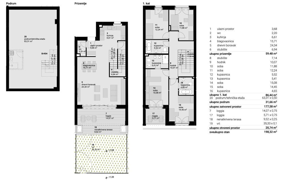 Park Kneževa, Branimirova - Kneza Borne, novogradnja, VMD, luksuzan dvoetažan peterosoban stan s vrtom, 198m2 sa duplom garažom 35m2 (17). Ukupno obračunski 215m2.Ovaj prekrasan stan razveden je u 3 etaže.Podrum 63,31m2: vešeraj, garderoba, igraonica.Prizemlje 59,48m2 sa loggiom 14,07m2, terasom 9,52m2 i vrtom 35,33m2: ulazni hall, kuhinja, prostran boravak.Kat 86,44m2 i loggia 5,77m2: četiri komforme spavaće sobe i tri kupaonice.Vrhunska oprema, etažno centralno podno grijanje, klimatiziran, alu drvo stolarija.Kuhinja sa svim aparatima i ugrađeni ormari u sobama. Postoji mogućnost da se stan u potpunosti namjesti.Park Kneževa nudi savršenu lokaciju i okruženje, u blizini svih bitnih sadržaja, samo 5 min lagane šetnje do strogog centra grada. U kompleksu se nalazi dječji vrtić, kvartovski lokal, fitness Gym 4 you.Ostale informacije na upit.... Više na eurovilla.hr, ID: 102983