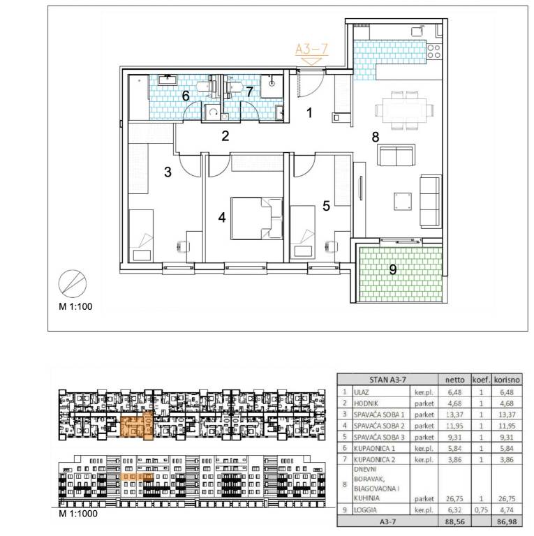 Četverosoban stan površine 86,98 m2 smješten na 3. katu.Stan A3-7 sastoji se od ulaza, 3 spavaće sobe, 2 kupaonice, dnevnog boravka, kuhinje s blagovaonicom te loggije.Velika Gorica, projekt stambene novogradnje namijenjen stalnom stanovanju, koji obuhvaća 91 stambenu jedinicu. U sklopu zgrade osigurano je ukupno 182 garažnih i parkirnih mjesta, od čega je 28 garažnih mjesta smješteno u prizemlju, 97 garažnih i parkirnih mjesta u podzemnoj etaži te dodatnih 57 parkirnih mjesta na razini terena.Uz kupnju stana obavezna je kupnja garažnog mjesta na -1 etaži po cijeni od 25.000,00 EUR ili garažnog mjesta na 0 etaži po cijeni od 30.000,00 EUR zajedno s parkirnim garažnim mjestom po cijeni od 18.000,00 EUR ili vanjskim parkirnim mjestom po cijeni od 10.000,00 EUR. Dakle, garažno mjesto na -1 etaži ili garažno mjesto na 0 etaži + garažno parkirno mjesto ili vanjsko parkirno mjesto.Građevina je projektirana kao armiranobetonska konstrukcija, međusobno povezana zidovima i gredama, s punim armiranobetonskim stropnim pločama i ravnim krovom. Vertikalni konstruktivni sustav čine armiranobetonski zidovi debljine 20 cm izvedeni kroz sve etaže, dok horizontalni sustav čine armiranobetonske ploče debljine 20 cm.Pročelje je predviđeno s toplinskom izolacijom debljine 15 cm u ETICS sustavu, izvedenom od EPS-a, a u zonama požarnih prekida, u kontaktu sa stubištem i na podgledu prizemlja od mineralne vune iste debljine. Završna obrada izvodi se armiranom mrežicom, gletanjem i završnim slojem u boji i teksturi prema projektu. Vanjska stolarija predviđena je kao PVC, u tonu definiranom projektom.Krov je projektiran kao ravni neprohodni krov, a svi slojevi izvedeni su u skladu s projektom fizike zgrade. Unutarnji pregradni zidovi izvode se kao gipskartonski, debljine 10 do 20 cm, ovisno o namjeni prostora, uz primjenu potrebne zvučne izolacije gdje je to predviđeno. Zidne površine su završno obrađene soboslikarskim radovima u boji prema projektu.Podovi u stanovima izvode se kao plivajući sustav s toplinskom izolacijom od polistirena i cementnim estrihom. Završne podne obloge predviđene su prema namjeni prostora: keramika u sanitarijama, kuhinjama i na vanjskim površinama, a troslojni hrastov parket u dnevnim boravcima, blagovaonicama, ulaznim prostorima i spavaćim sobama. U ponudi su tri varijante keramičkih pločica.Grijanje je riješeno plinskim etažnim podnim sustavom. Stanovi su opremljeni klima uređajima marke Bosch, PVC stolarijom s električnim roletama, troslojnim hrastovim parketom te sobnim vratima proizvođača RV Križevci. Ulazna vrata u stanove su protuprovalna, proizvođača Kolnoa sa sustavom zaključavanja Multilock.Useljenje 05/27Za sva pitanja Vam stojimo na raspolaganju.... Više na eurovilla.hr, ID: 247810