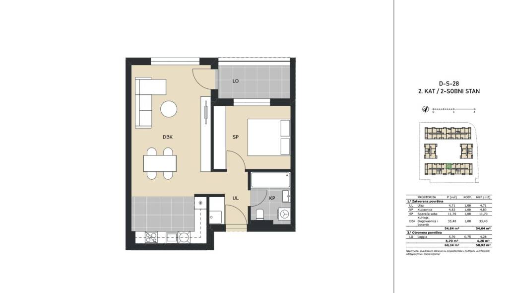 Dvosoban stan na 2. katu stambene zgrade zatvorene površine 54,64 m2 s loggijom 5,70 m2 (4,28 m2), ukupne neto površine 58,92 m2.Stan D-28 sastoji se od ulaza, kupaonice, spavaće sobe, kuhinje s blagovaonicom te dnevnog boravka.Obvezna kupnja spremišta, vanjskog ili garažnog parkirnog mjesta.Stan se nalazi u višestambenoj zgradi unutar kompleksa koji će se sastojati od 165 stambenih jedinica.Green Side Residence nalazi se u Velikoj Gorici, samo 10 kilometara od Zagreba i tek 3 kilometra od Međunarodne zračne luke Zagreb, lokacija nudi izvrsnu prometnu povezanost s glavnim gradom i cijelom Hrvatskom, zahvaljujući neposrednom pristupu dvjema autocestama.Okružen zelenilom, a opet u blizini svih gradskih sadržaja, ovaj projekt predstavlja idealan izbor za miran, ali povezan život.Useljenje 11/2027. godine.Za sve ostale informacije stojimo na raspolaganju.... Više na eurovilla.hr, ID: 264144