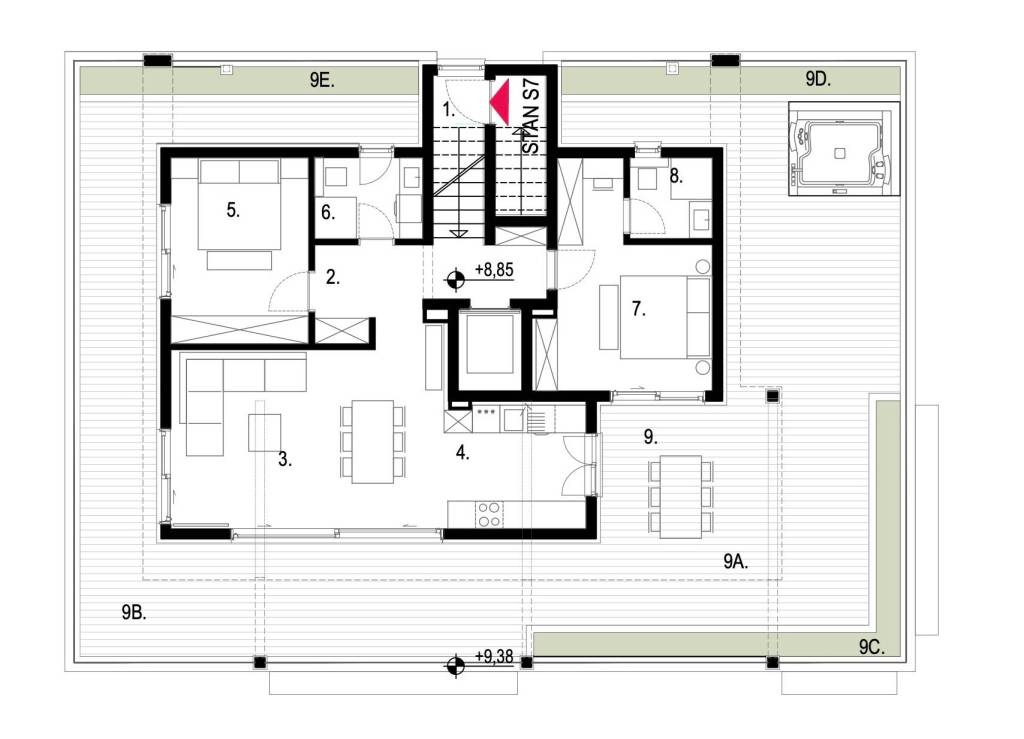 Kaštela, luksuzan penthouse na trećem katu urbane zgrade s panoramskim pogledom, liftom, direktno povezan s podzemnom garažom.Komforan stan veličine 102,3 m2, od čega je zatvoreni stambeni dio 79,12 m2, uz natkrivenu terasu od 23,2 m2 i veliku nenatkrivenu terasu sa žardinjerama 87,6 m2. Sastoji se od moderne kuhinje visokog standarda s blagovaonicom te dnevnog boravka otvorenog tipa (32,6 m2), hodnika i stubišta, dvije komforne spavaće sobe (master soba s vlastitom en-suite kupaonicom), potpuno opremljene kupaonice, velike terase (119,6 m2 od čega je natkriveni dio 23,2 m2). Iz stana se, kao i s terase, pruža prekrasan panoramski pogled na Kaštelanski zaljev.Dodatno opcija je kupnja garažnog parkirnog mjesta kao i ostave u garaži zgrde.Na prekrasnoj okućnici ugrađen je automatiziran sustav navodnjavanja zelenih površina te je zasađeno mediteransko odraslo bilje, a zgrada ima i osobu zaduženu za brigu i održavanje prostora i zelenila. Orijentacija stana je jug- istok, a velike staklene stijene osiguravaju obilje prirodnog svjetla i prozračnost, što doprinosi komforu življenja u ovoj nekretnini.Odlična pozicija, u blizini svih sadržaja potrebnih za ugodan život, sve na par min hoda, kao i plaža te šetnica uz more. Izvrsna prometna povezanost i komforan pristupni put do zgrade. Međunarodna Zračna luka Split udaljena je 10 km, a u blizini je i poznata marina za brodove "Kaštela", te izvrsna pristupačna brza cesta.Grad Kaštela, s jednom od najduljih obala u Hrvatskoj, smješten je između dva UNESCO-ova grada, Splita i Trogira do kojih se stiže kratkom i ugodnom vožnjom. Zahvaljujući izvrsnoj lokaciji, predivnom prirodnom okruženju i bogatoj ponudi sadržaja, predstavlja idealno mjesto za ugodan i kvalitetan život.Nekretnina je odlično ulaganje za tvrtke u sustavu PDV-a.Planirani završetak radova 08/2025. godine.Visoko kvalitetna gradnja i korištena oprema:postavljene podove, parket i keramičke pločice visoke klaseelektrično podno grijanje s digitalnim upravljanjem ugrađeno u kupaonicikompletno opremljena kupaonica (električni bojler za grijanje vode, sanitarije, walk-in tuš u okviru zadanog cjenovnog ranga)ulazna protuprovalna i protupožarna vrataInverter klima uređaj snage 3,5 kW u dnevnom boravku i svim sobamaunutarnja stolarija bijele boje i ravnih, modernih linijavanjska stolarija antracit kombinacija Alu- PVC, s podizno kliznim stijenkamaoluci skriveni u fasadivrhunska toplinska i zvučna izolacija, vanjska fasada 8 cm kamena vunaNekretnina će biti izvedena u rangu A+ energetskog certifikata sukladno standardima.Za više informacija stojimo Vam na raspolaganju.... Više na eurovilla.hr, ID: 347349