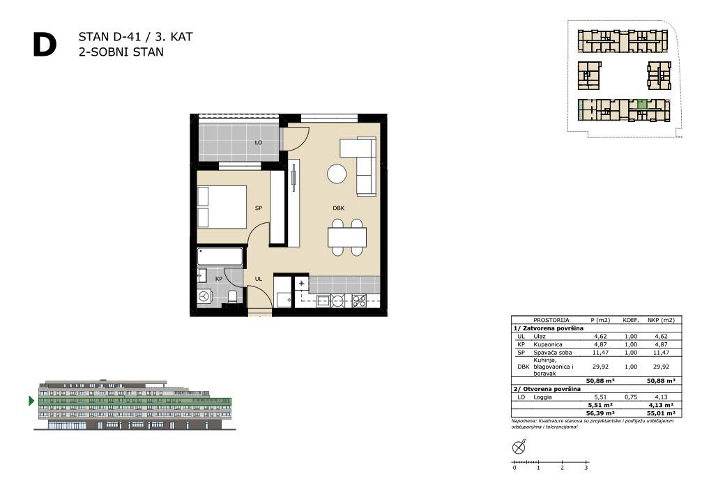 Dvosoban stan na 3. katu stambene zgrade zatvorene površine 50,88 m2 s loggiom 5,51 m2 (4,13), ukupne neto površine 55,01 m2.Stan D-41 sastoji se od ulaznog hodnika, kuhinje s blagovaonicom i dnevnim boravkom, predsoblja, spavaće sobe, kupaonice i loggie.Obvezna kupnja spremišta, vanjskog ili garažnog parkirnog mjesta.Stan se nalazi u višestambenoj zgradi unutar kompleksa koji će se sastojati od 165 stambenih jedinica.Green Side Residence nalazi se u Velikoj Gorici, samo 10 kilometara od Zagreba i tek 3 kilometra od Međunarodne zračne luke Zagreb, lokacija nudi izvrsnu prometnu povezanost s glavnim gradom i cijelom Hrvatskom, zahvaljujući neposrednom pristupu dvjema autocestama.Okružen zelenilom, a opet u blizini svih gradskih sadržaja, ovaj projekt predstavlja idealan izbor za miran, ali povezan život.Useljenje 11/2027. godine.Za sve ostale informacije stojimo na raspolaganju.... Više na eurovilla.hr, ID: 493877