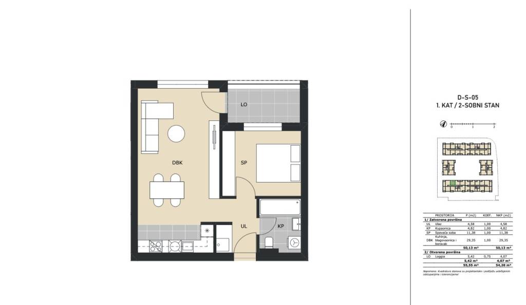 Dvosoban stan na 1. katu stambene zgrade zatvorene površine 50,13 m2 s loggiom 5,42 m2 (4,07), ukupne neto površine 54,20 m2.Stan D-5 sastoji se od ulaznog hodnika, kuhinje s blagovaonicom i dnevnim boravkom, predsoblja, spavaće sobe, kupaonice i loggie.Obvezna kupnja spremišta, vanjskog ili garažnog parkirnog mjesta.Stan se nalazi u višestambenoj zgradi unutar kompleksa koji će se sastojati od 165 stambenih jedinica.Green Side Residence nalazi se u Velikoj Gorici, samo 10 kilometara od Zagreba i tek 3 kilometra od Međunarodne zračne luke Zagreb, lokacija nudi izvrsnu prometnu povezanost s glavnim gradom i cijelom Hrvatskom, zahvaljujući neposrednom pristupu dvjema autocestama.Okružen zelenilom, a opet u blizini svih gradskih sadržaja, ovaj projekt predstavlja idealan izbor za miran, ali povezan život.Useljenje 11/2027. godine.Za sve ostale informacije stojimo na raspolaganju.... Više na eurovilla.hr, ID: 574077
